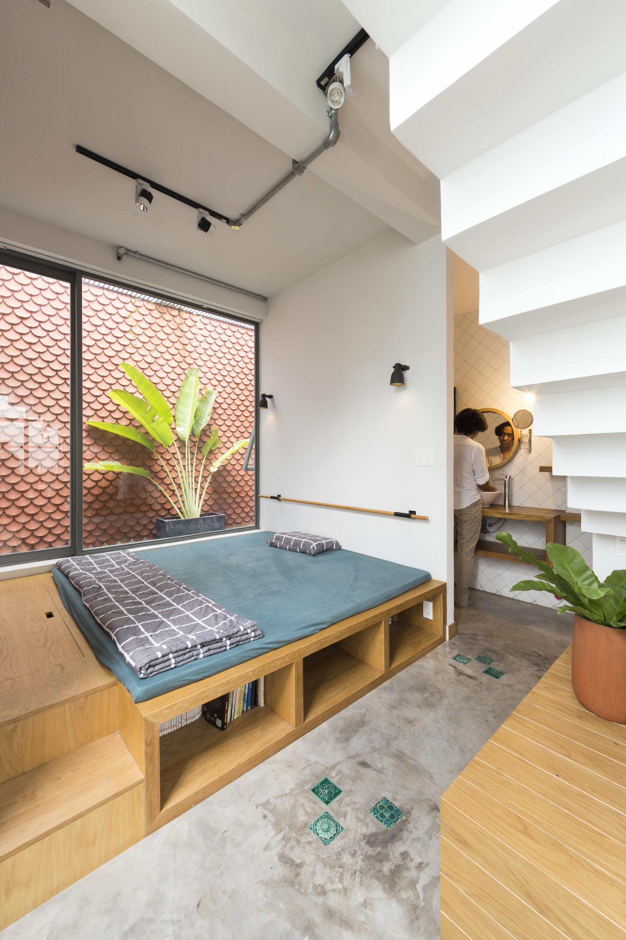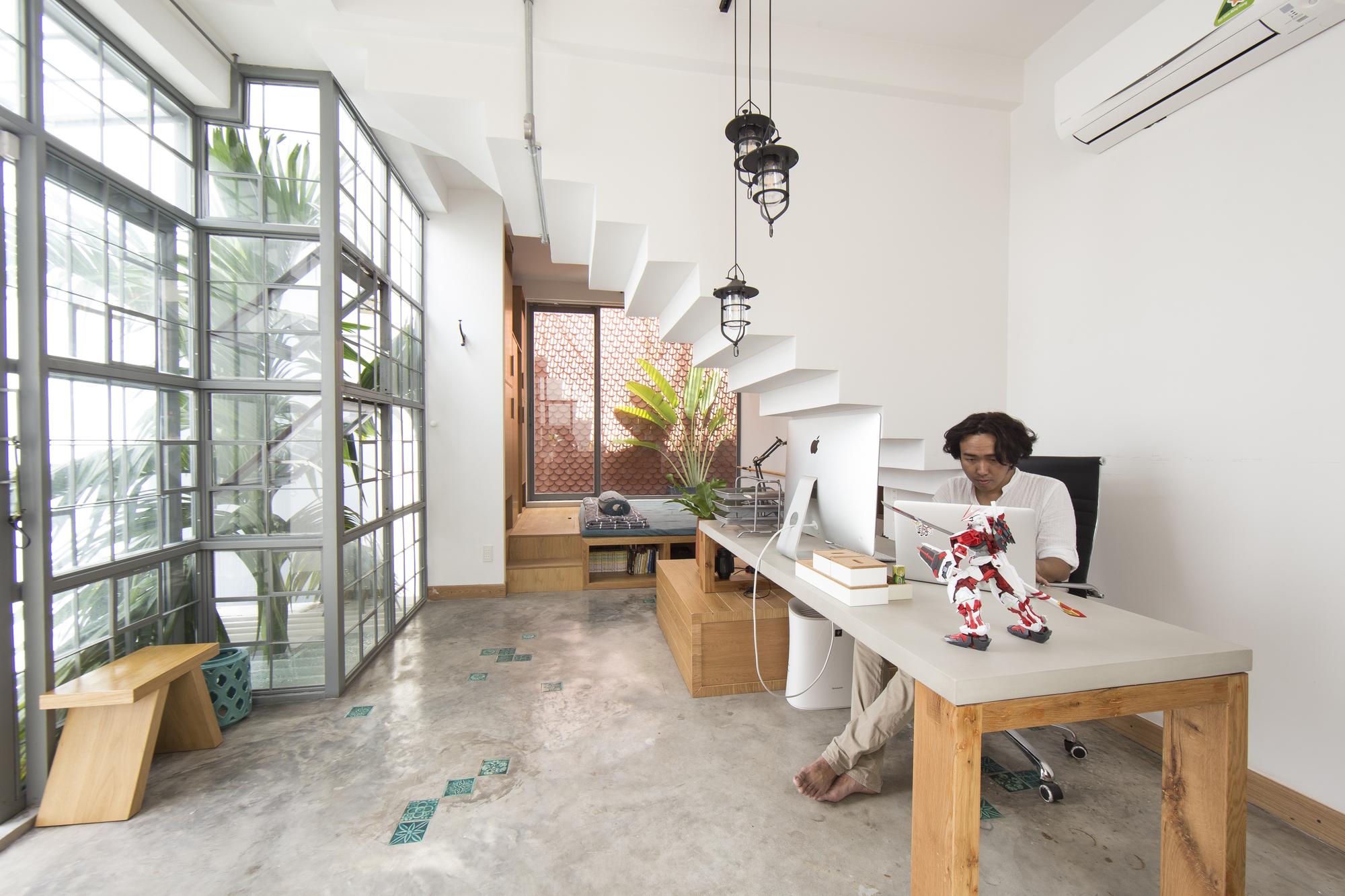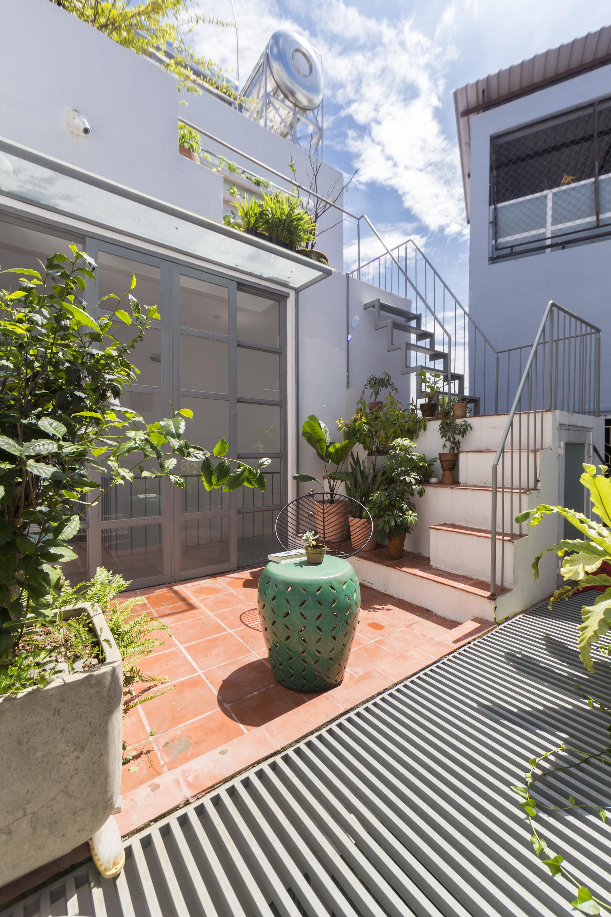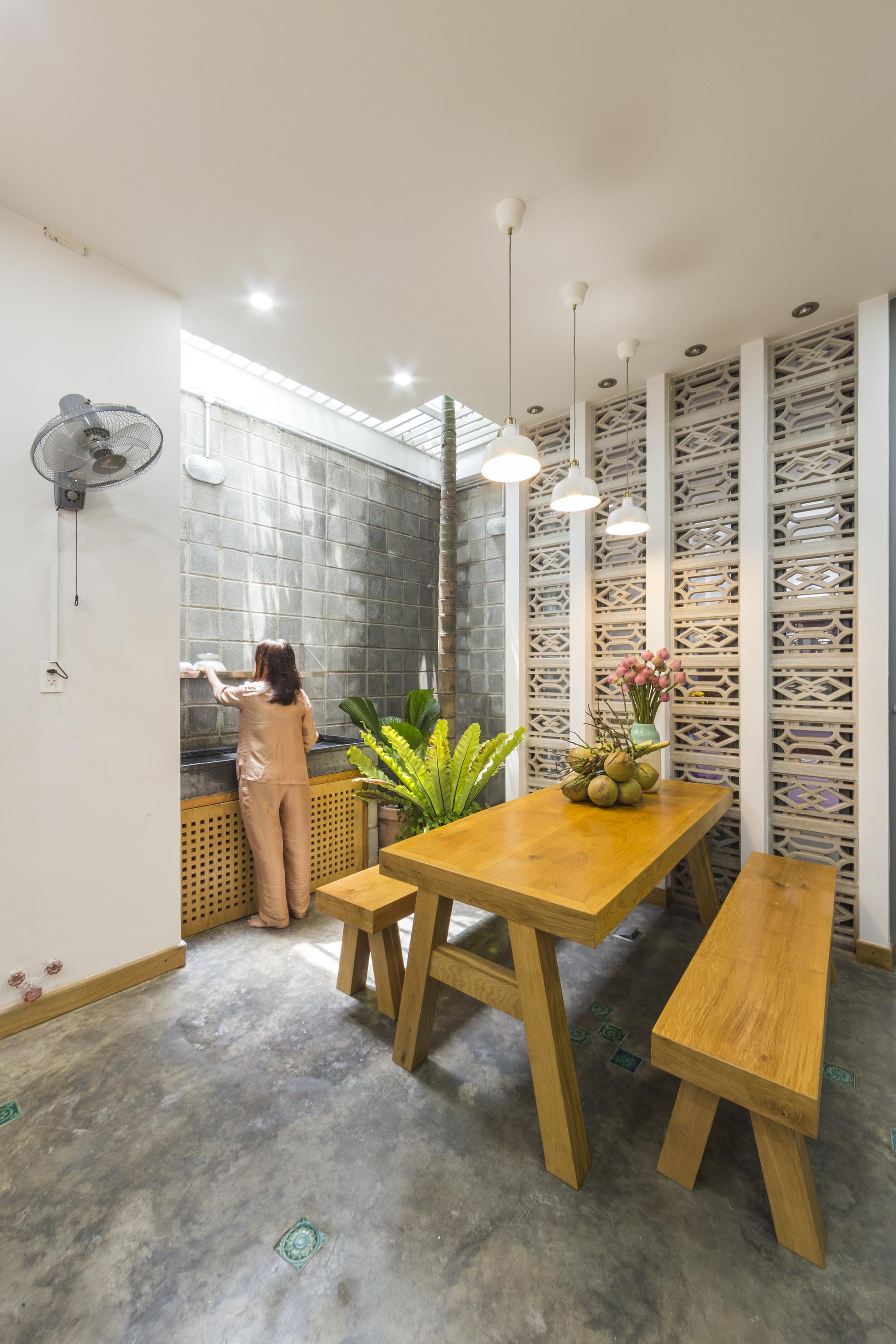 Là một nhà thiết kế, chủ sở hữu đóng góp rất lớn vào thiết kế nội thất, hoàn thành ngôi nhà của riêng mình với một bảng màu mộc mạc của sơn trắng, xi măng xám, và bê tông cùng với đất nung đỏ và đá. Một tính năng quan trọng khác của thiết kế là giếng trời rải rác với cây xanh. Những thứ này lấp đầy không gian bằng ánh sáng tự nhiên, một phương tiện kết hợp tất cả các màu sắc và vật liệu khác nhau của thiết kế.