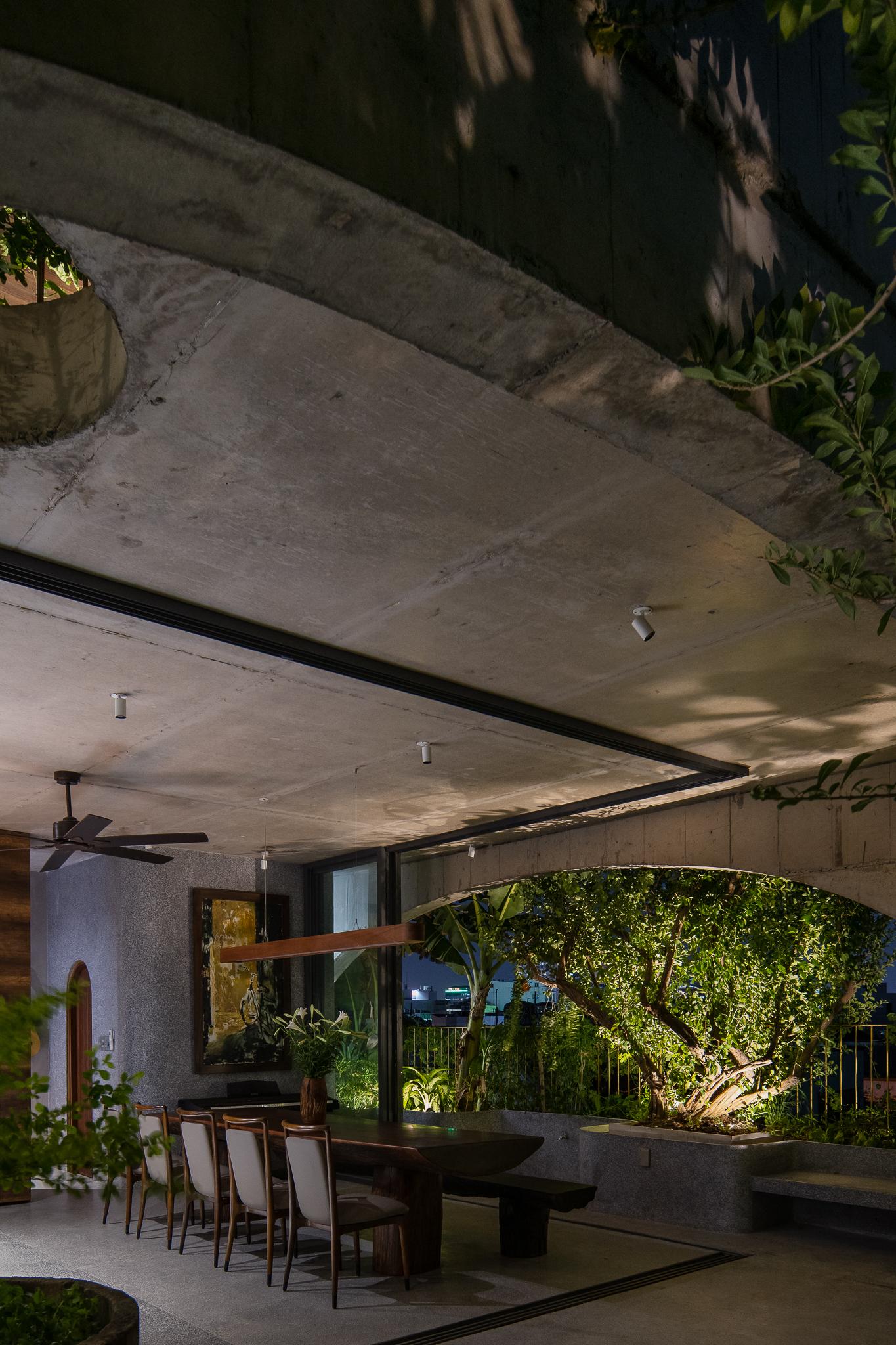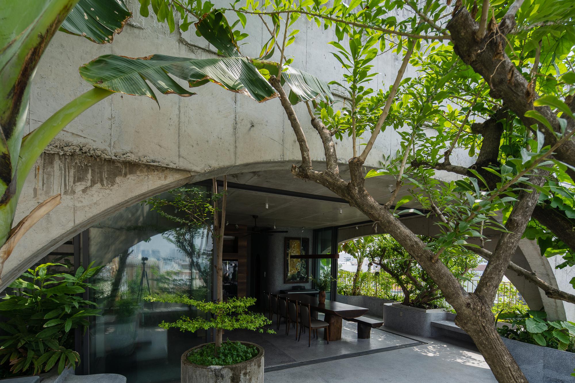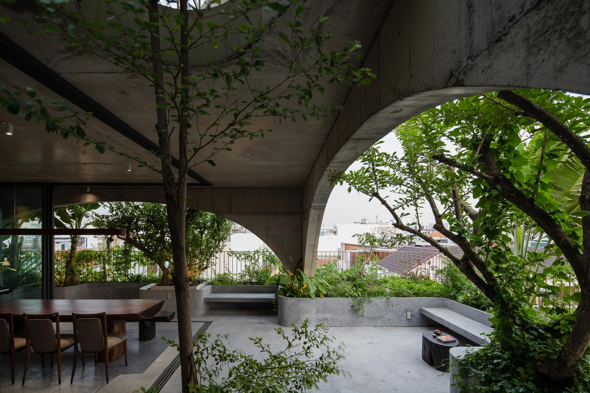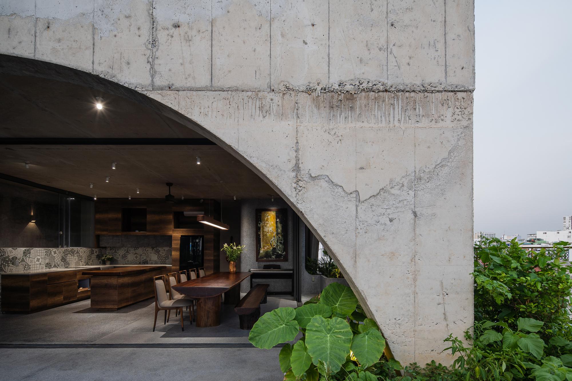 Đặc biệt, chủ nhà dành tầng 5 nơi có tầm nhìn ra thành phố, làm không gian bếp mở tạo cảm giác hòa mình vào thiên nhiên. Không gian thoáng đãng này đối lập với nhịp sống tĩnh lặng ẩn hiện sau những bức tường bê tông hình vòng cung và vườn rau, cây ăn quả xung quanh.