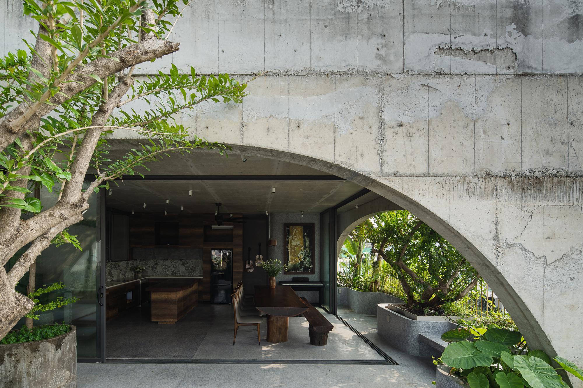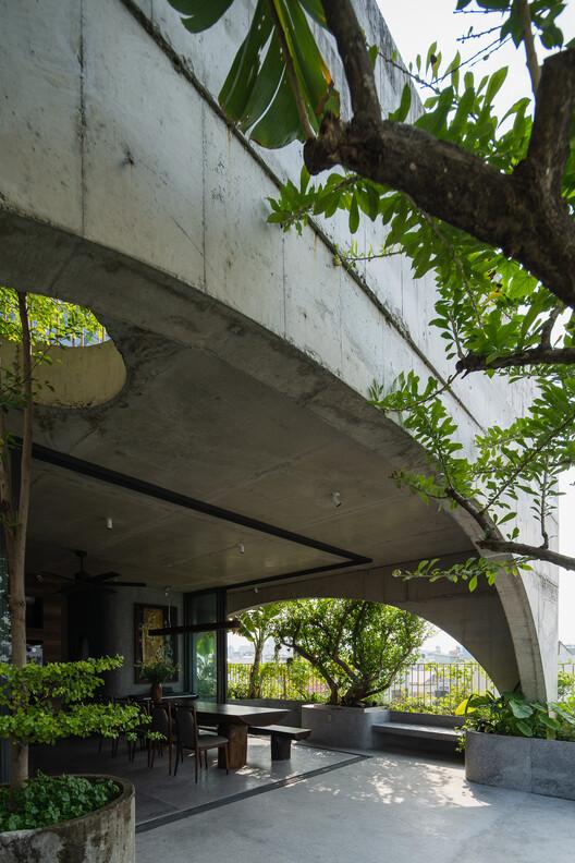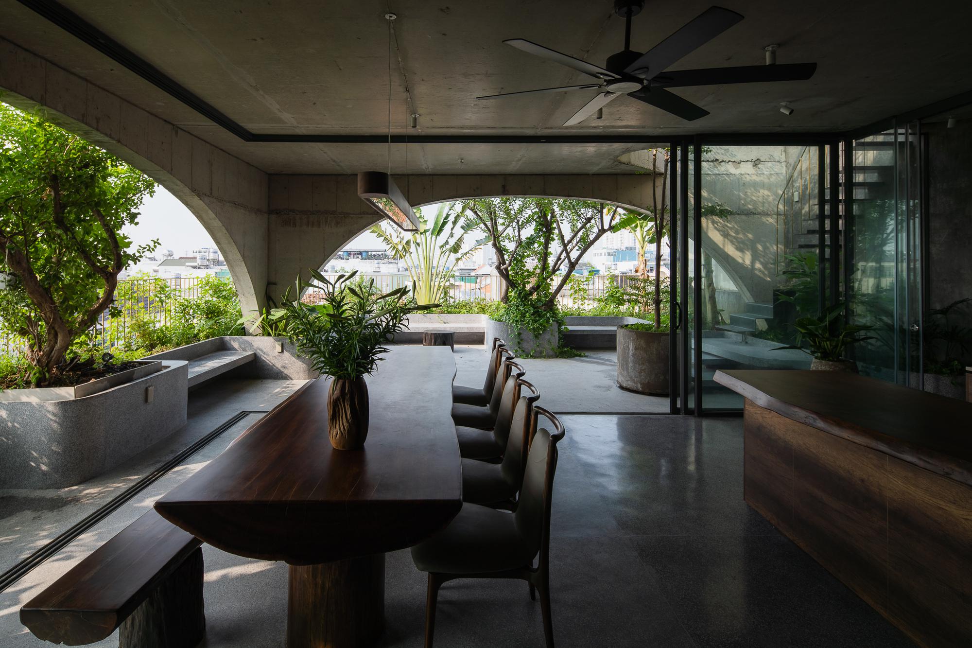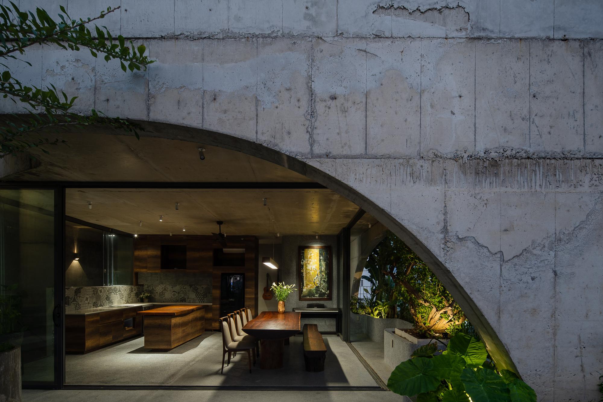 Đặc biệt, chủ nhà dành tầng 5 nơi có tầm nhìn ra thành phố, làm không gian bếp mở tạo cảm giác hòa mình vào thiên nhiên. Không gian thoáng đãng này đối lập với nhịp sống tĩnh lặng ẩn hiện sau những bức tường bê tông hình vòng cung và vườn rau, cây ăn quả xung quanh.