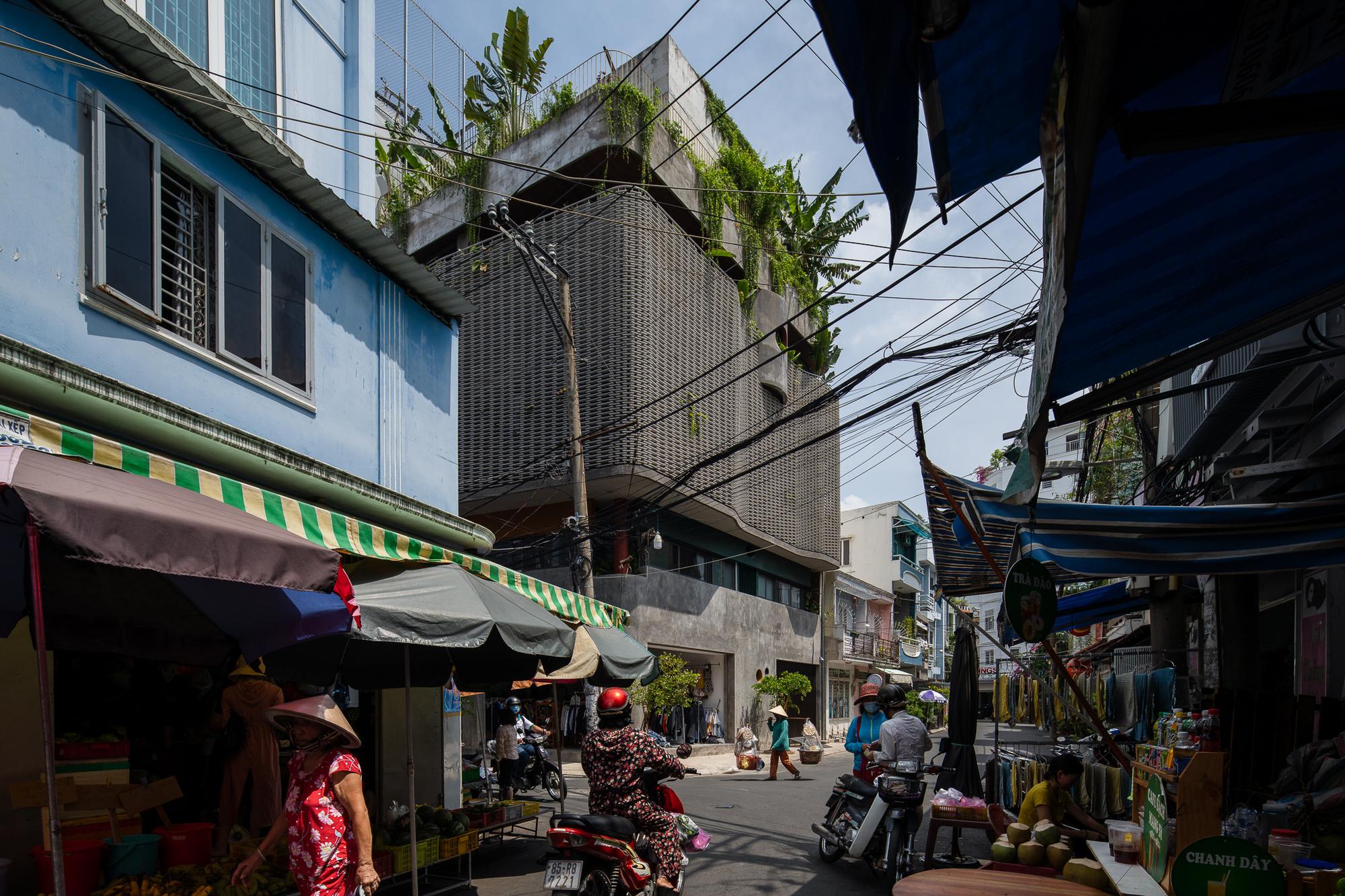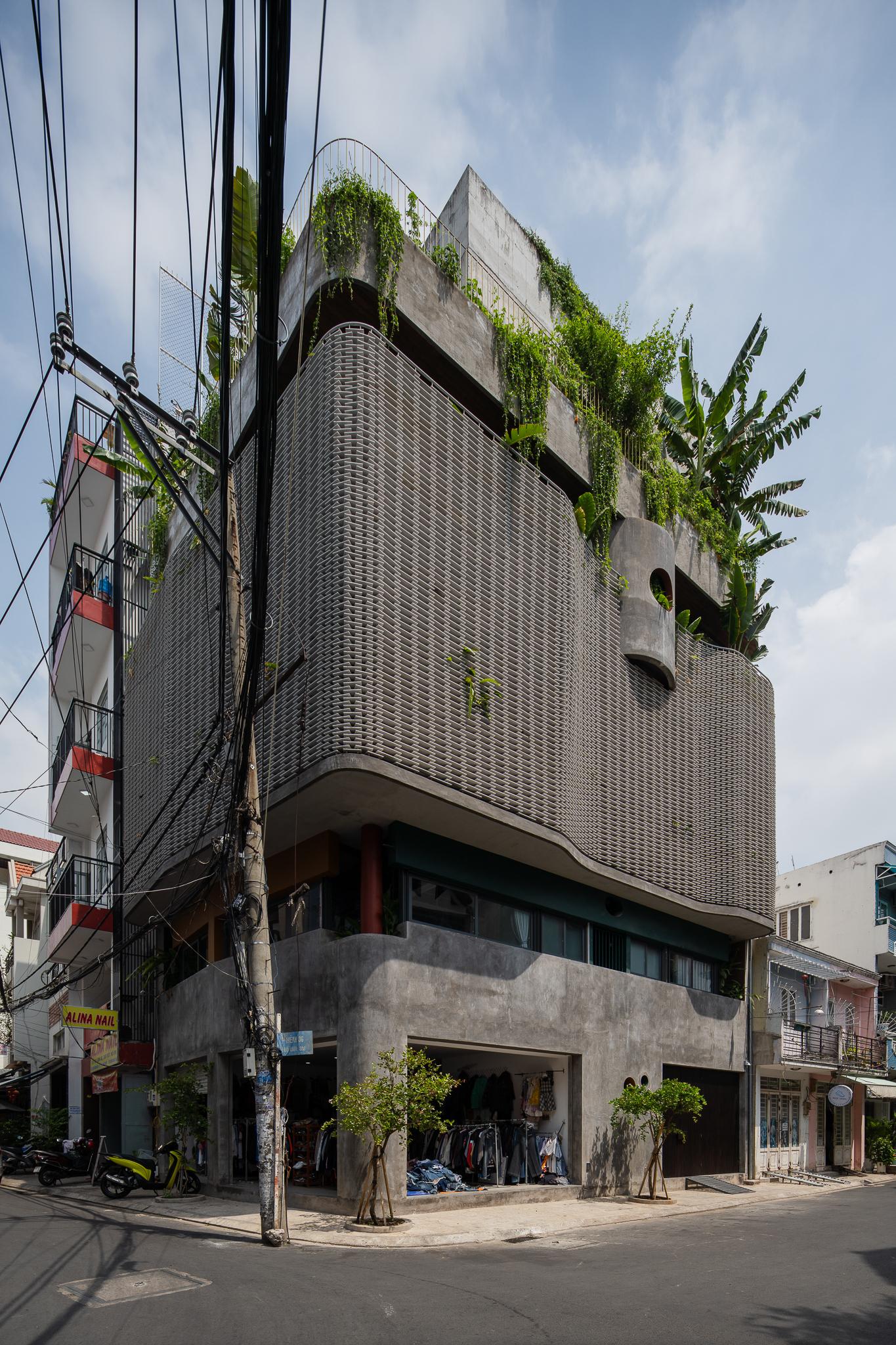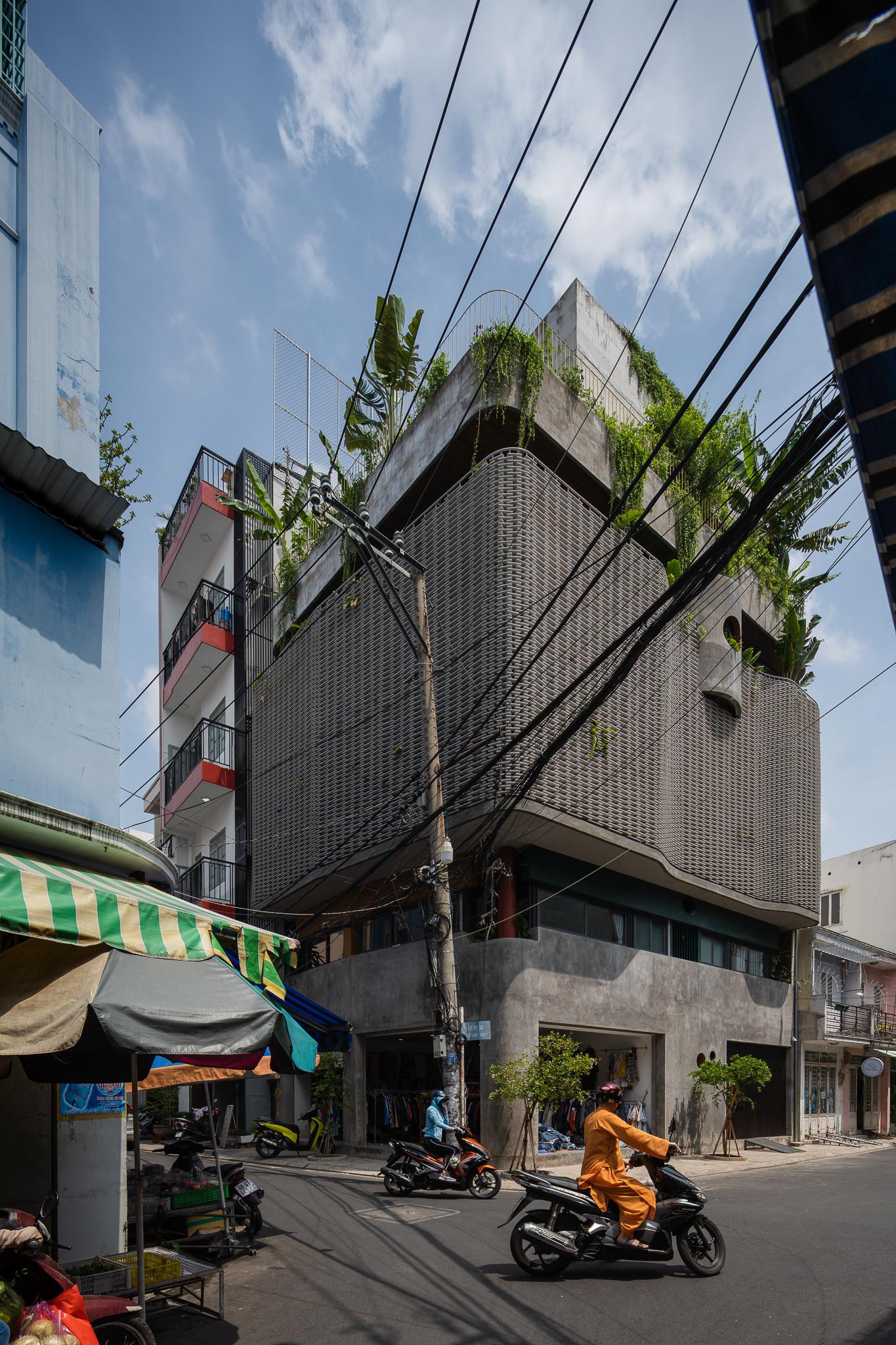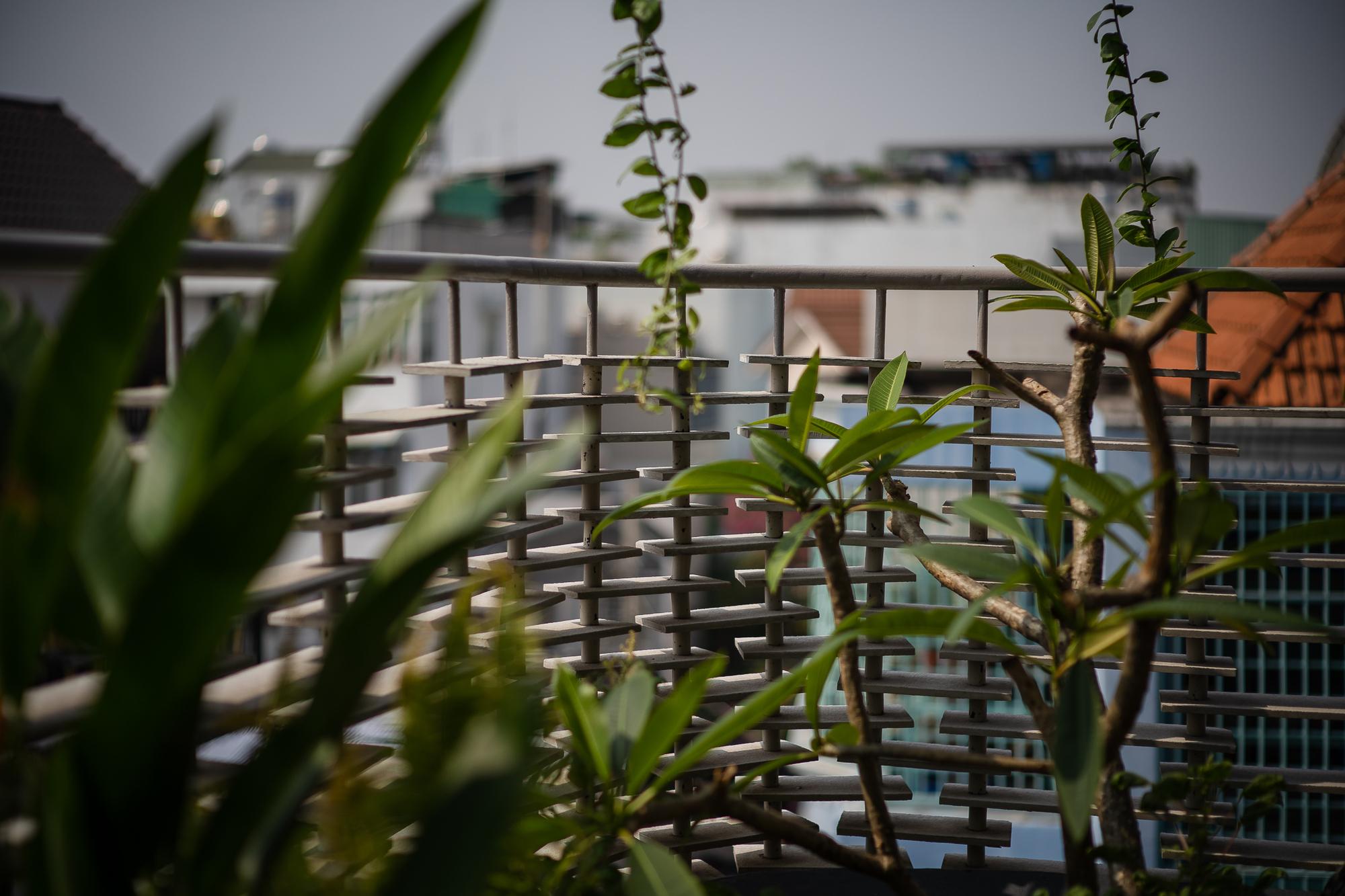 Do đất gần chợ nên chính chủ cho thuê tầng 1 để kinh doanh. Các tầng khác, chủ nhà muốn có sự khác biệt so với không gian bên ngoài nên H2 tạo mảng che bằng cây xanh kết hợp tường thông gió được làm bằng khung sắt và ván cemboard.