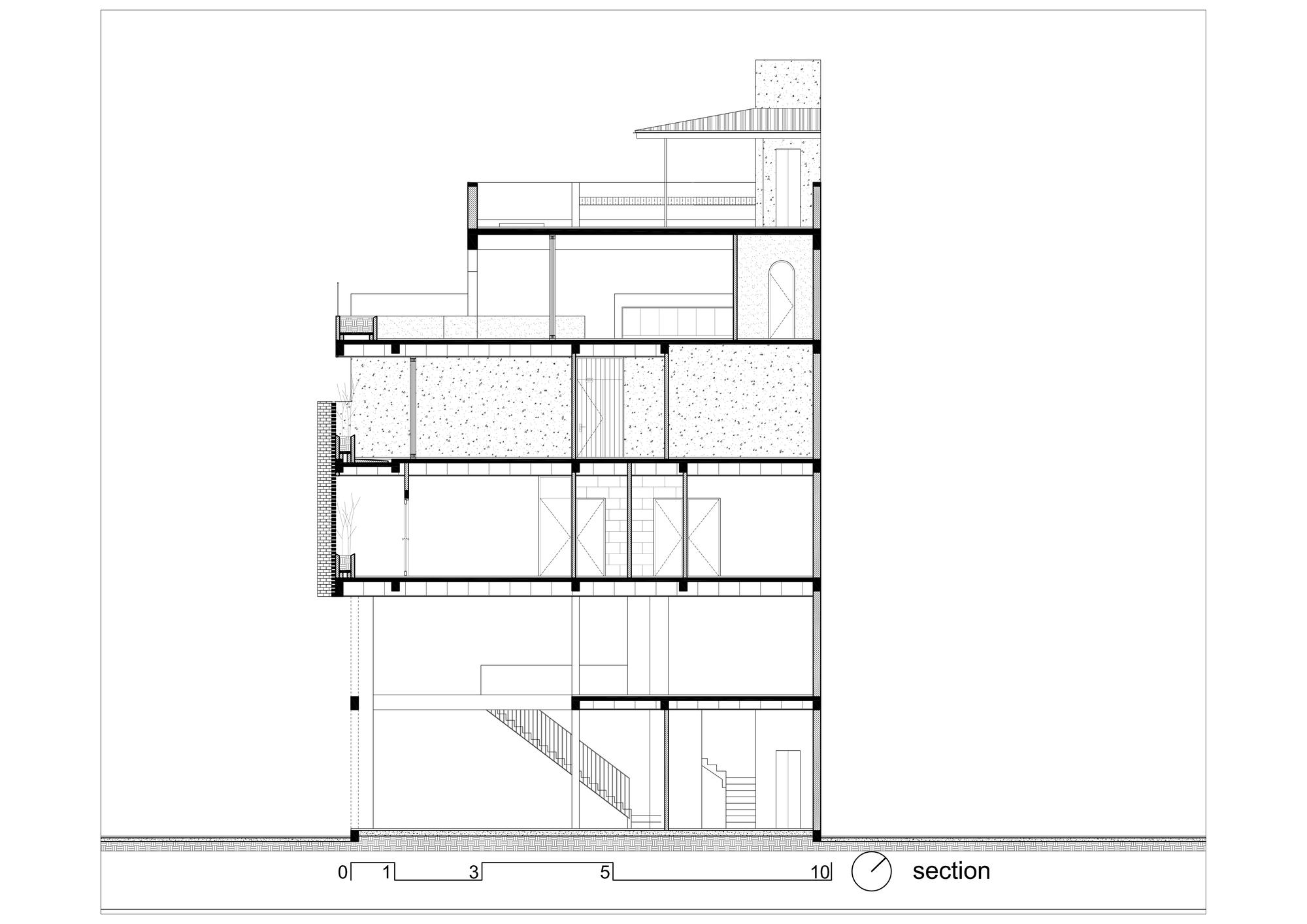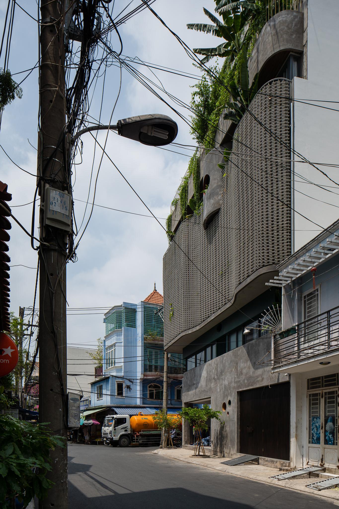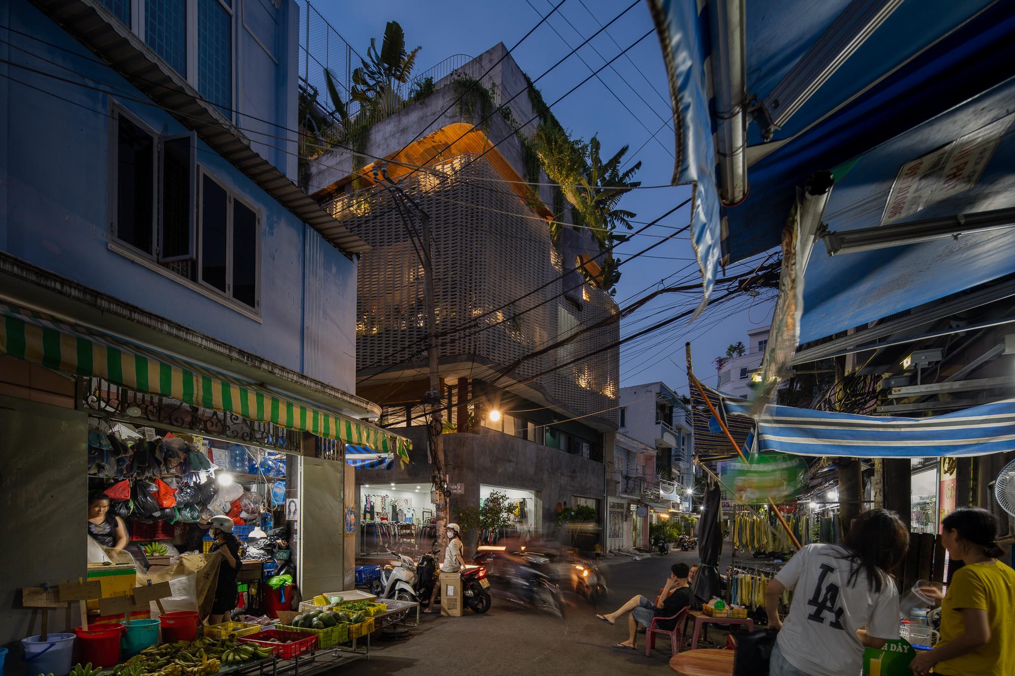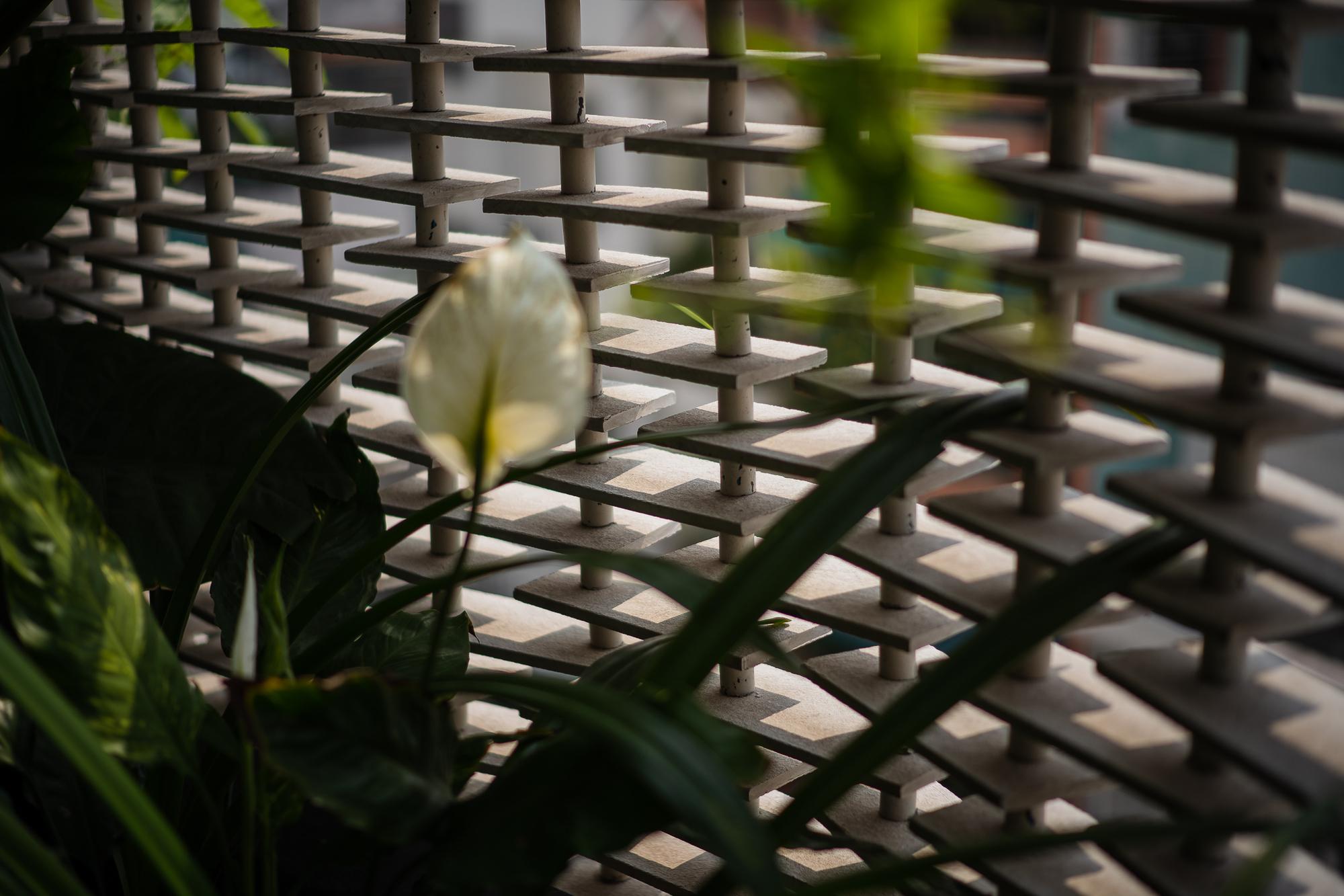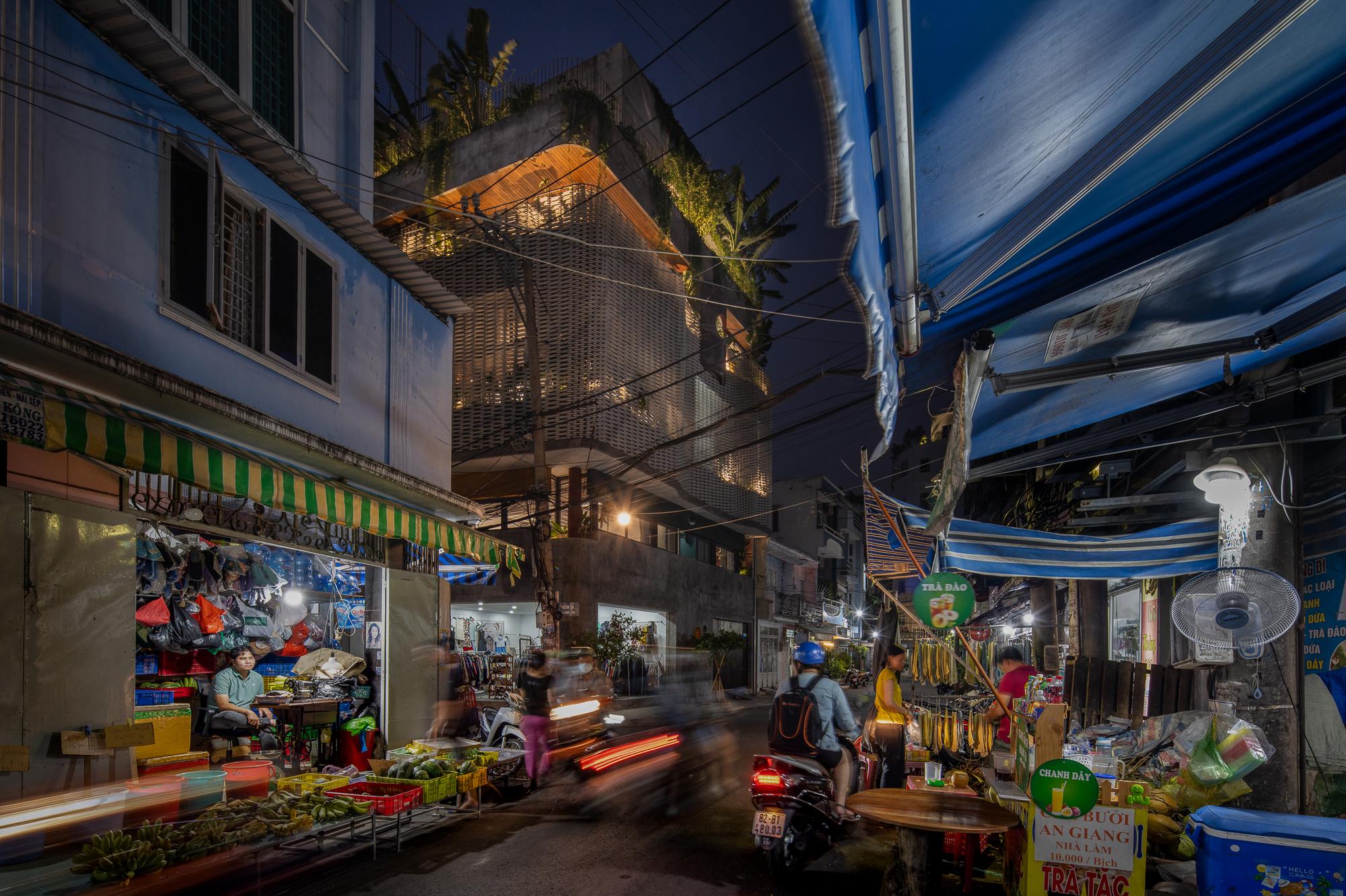 Do đất gần chợ nên chính chủ cho thuê tầng 1 để kinh doanh. Các tầng khác, chủ nhà muốn có sự khác biệt so với không gian bên ngoài nên H2 tạo mảng che bằng cây xanh kết hợp tường thông gió được làm bằng khung sắt và ván cemboard.