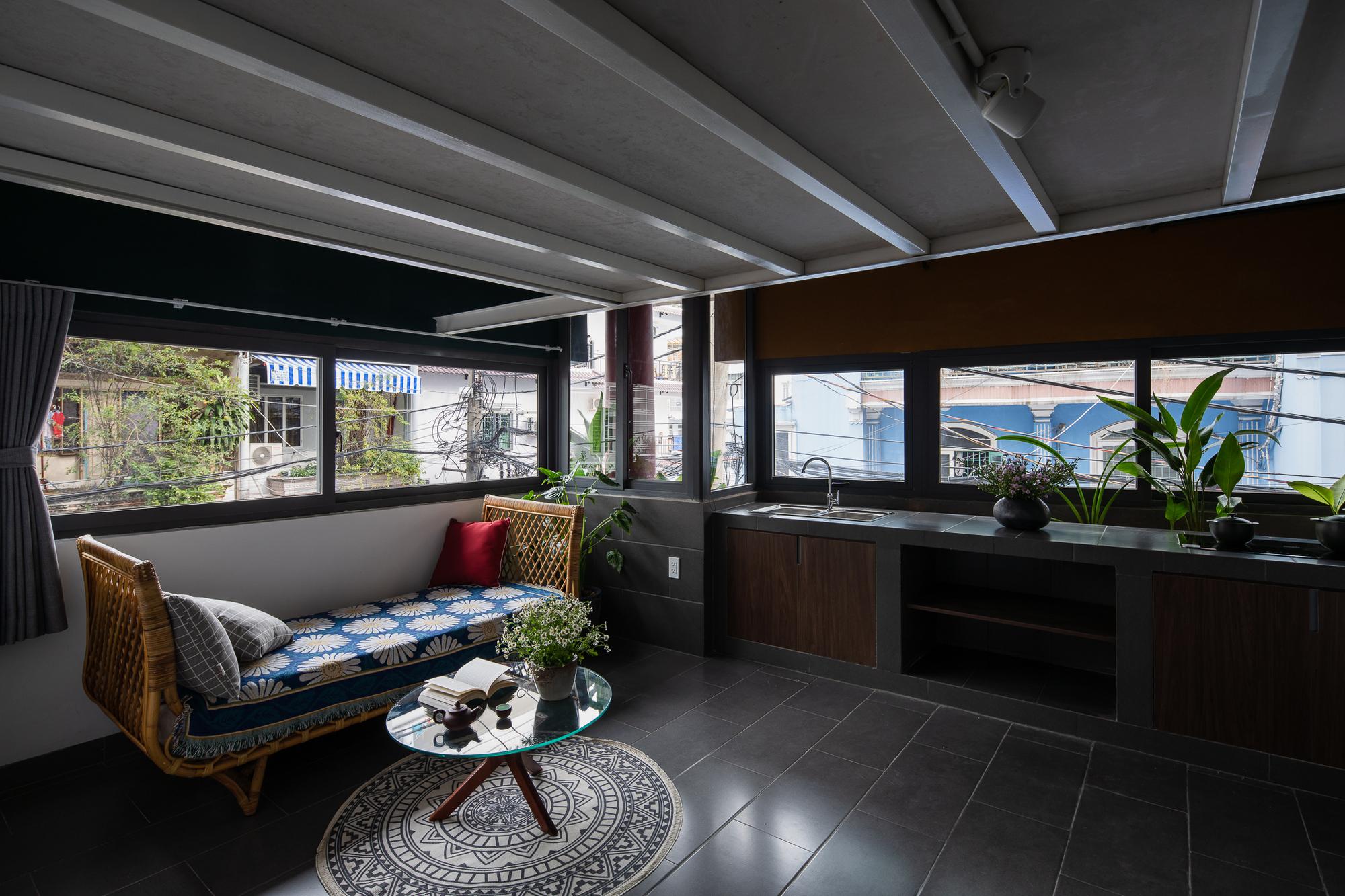 Tầng thượng là phòng làm việc của gia chủ, kết hợp với bếp thông qua một cầu thang nhỏ lộ thiên theo kiểu bậc tam cấp tạo nên không gian nhẹ nhàng hơn cho ngôi nhà.