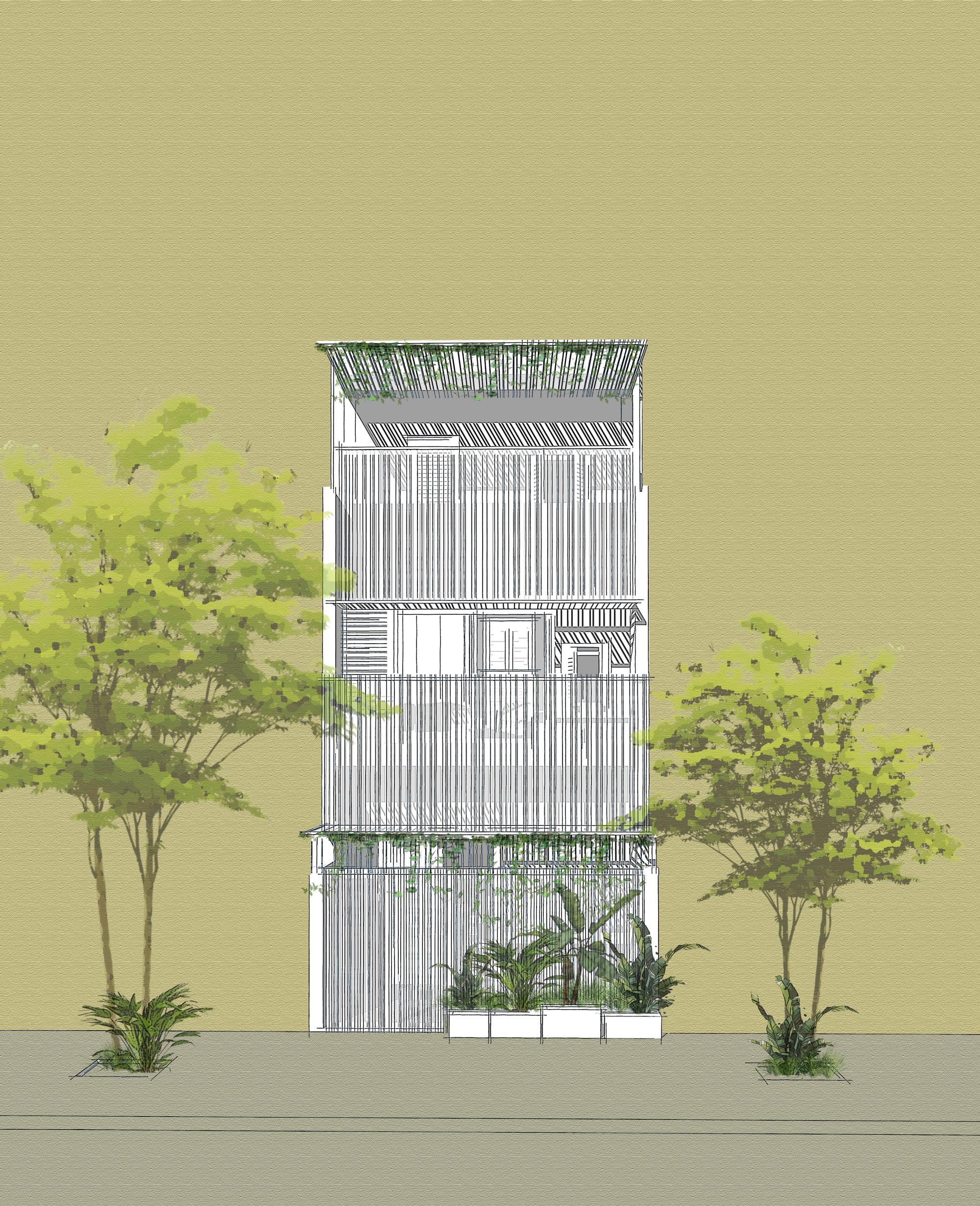 Đối thoại kiến trúc-Nhân văn và tôn trọng thiên nhiên: Một quỹ đất nhỏ được ưu tiên xây dựng một công viên cây xanh. Công viên này là không gian để kết nối cư dân, đặc biệt là trẻ em và người lớn tuổi. Dự án của chúng tôi được coi là một vật thể hữu cơ gắn liền với công viên, khá nhạy cảm với bất kỳ hình thức nào của mặt tiền. Giải pháp ở đây là tích hợp hữu cơ vào công viên cảnh quan. Chúng tôi tạo ra một tấm màn che nắng mềm mại được truyền cảm hứng từ kiến trúc truyền thống Việt Nam. Với các vật liệu hiện đại là thép và lưới thép, một kiến trúc ẩn giữa thiên nhiên bên trong đô thị từ ý nghĩa thị giác. Vật liệu này sẽ tạo ra một lớp gỉ màu trên bề mặt dần dần theo thời gian mà cây trong công viên đủ chiều cao để làm cho dự án dễ dàng tương tác về màu sắc. Đây là cuộc trò chuyện giữa kiến trúc và cảnh quan, chúng tôi muốn đánh thức sự tôn trọng cần thiết để đối phó với cảnh quan.