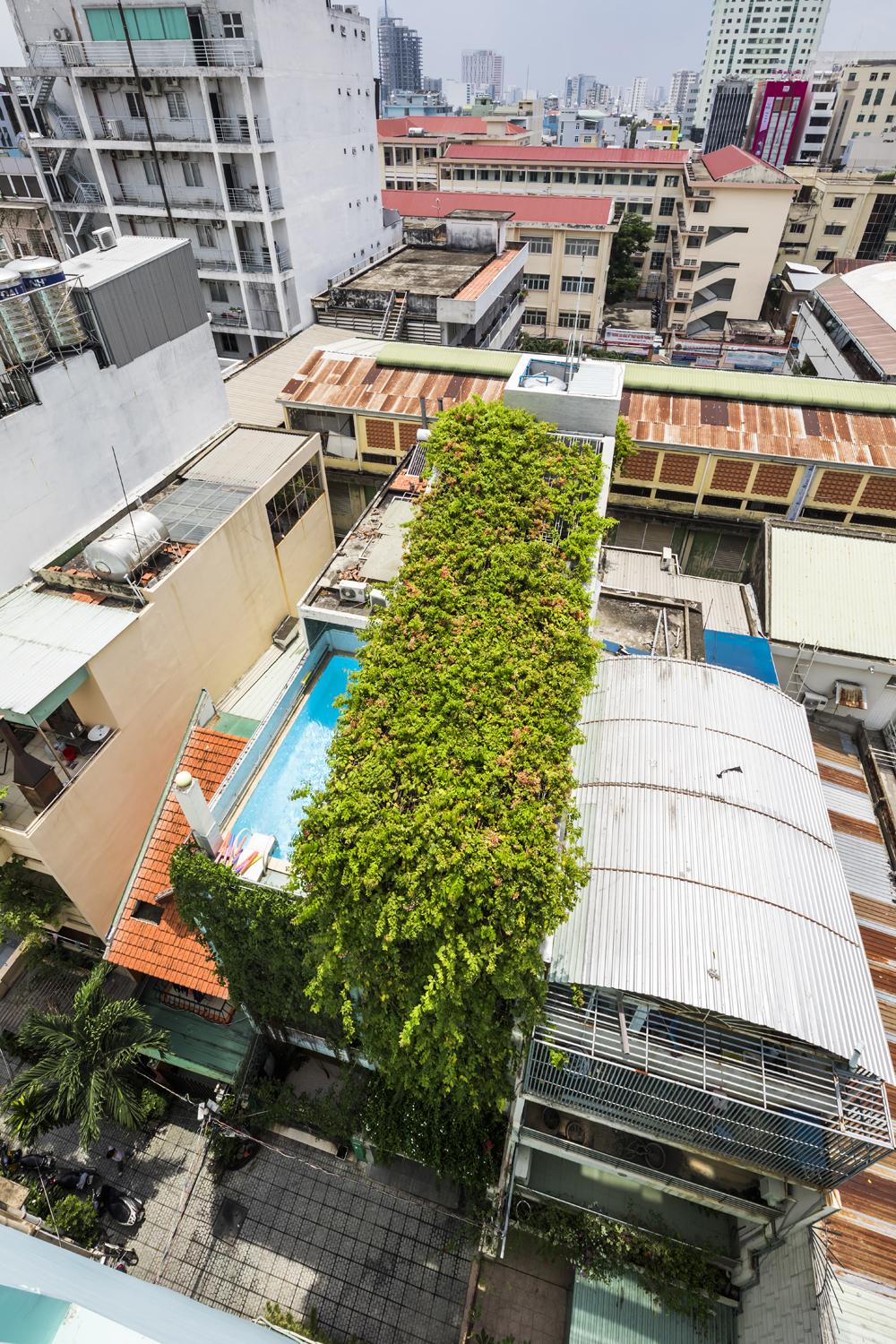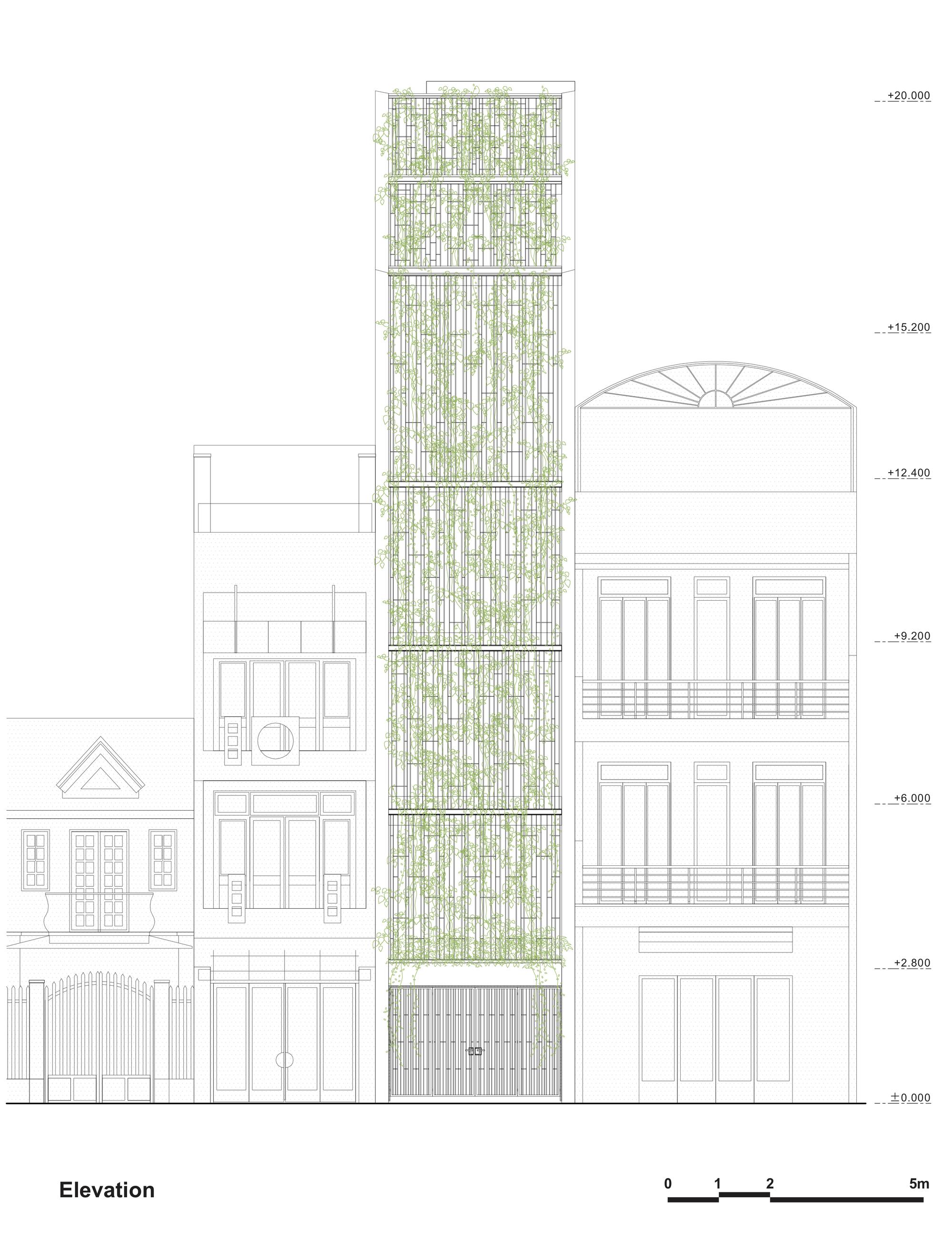 Sân thượng được bao phủ bởi mạng che mặt màu xanh lá cây, trở thành một không gian đầy cây xanh, điều hiếm thấy ở khu vực thành phố đông đúc. Ý nghĩa của dự án là nó tạo ra một không gian xanh, ở trung tâm của một thành phố lớn đang phát triển. Chúng tôi hy vọng bản chất của thiết kế này sẽ mang lại ảnh hưởng tích cực cho các thành phố ở Việt Nam, nơi đang mất đi không gian xanh với tốc độ đáng báo động.