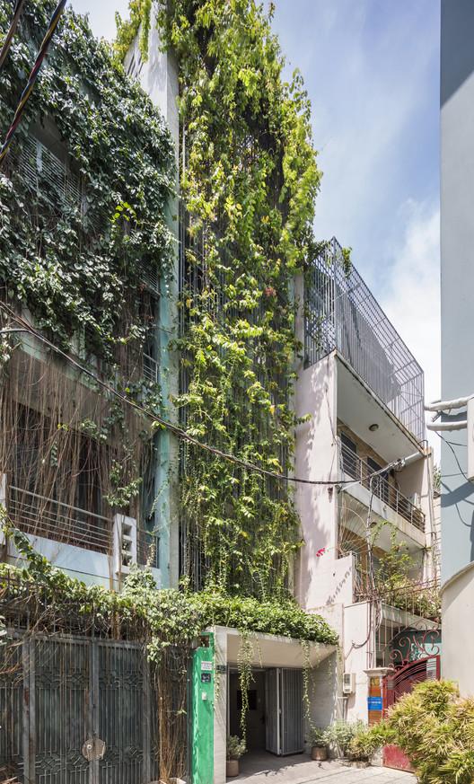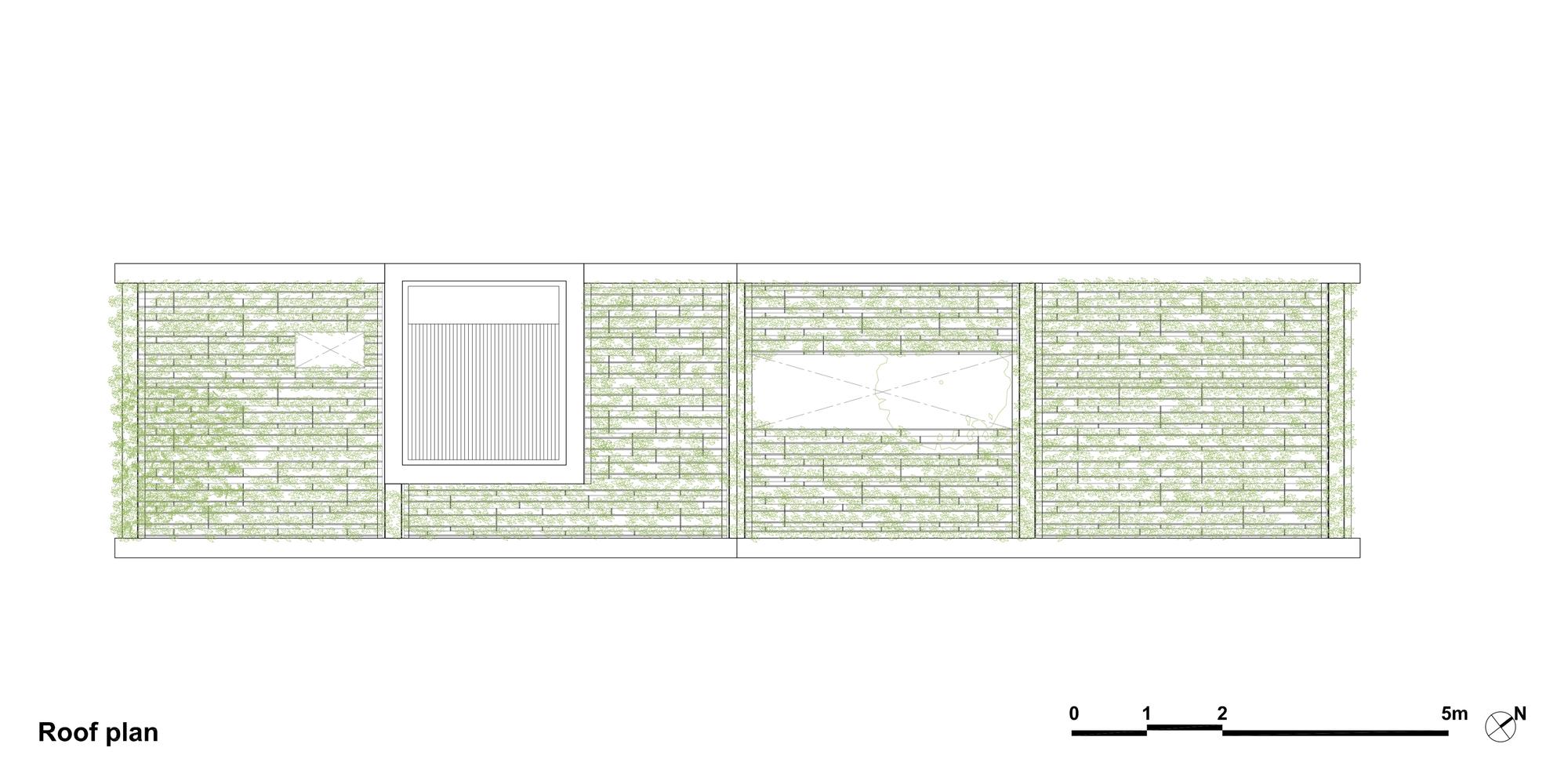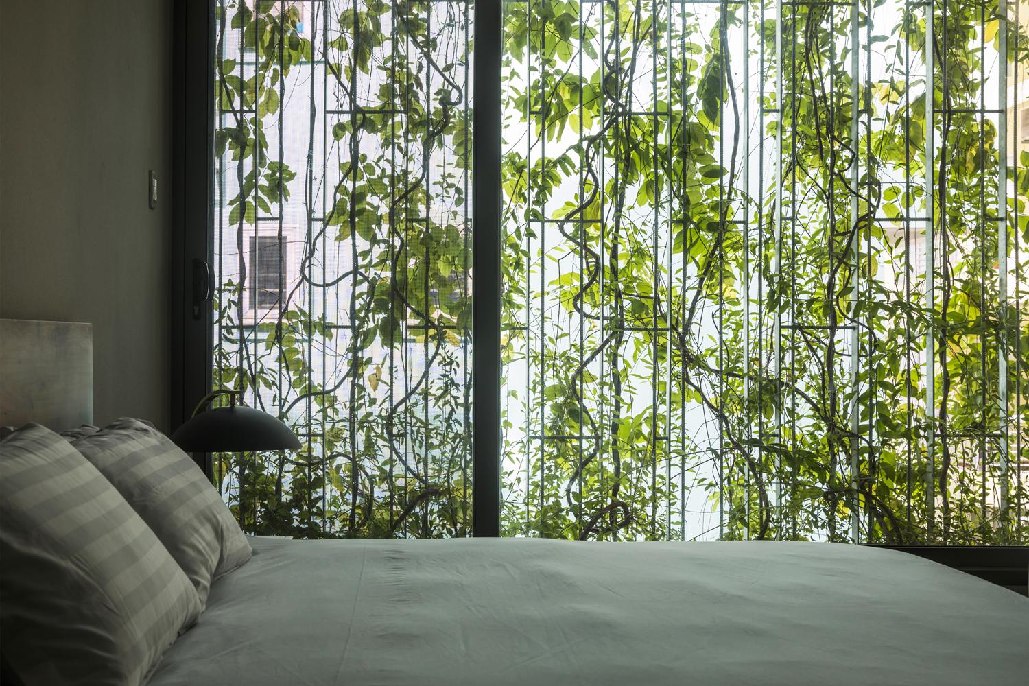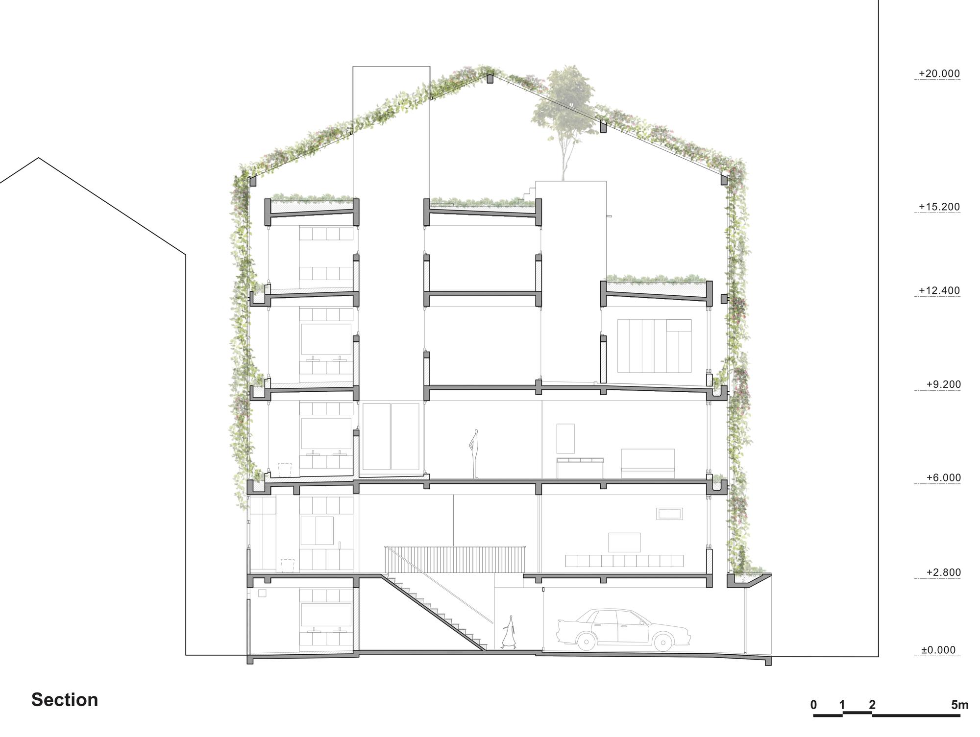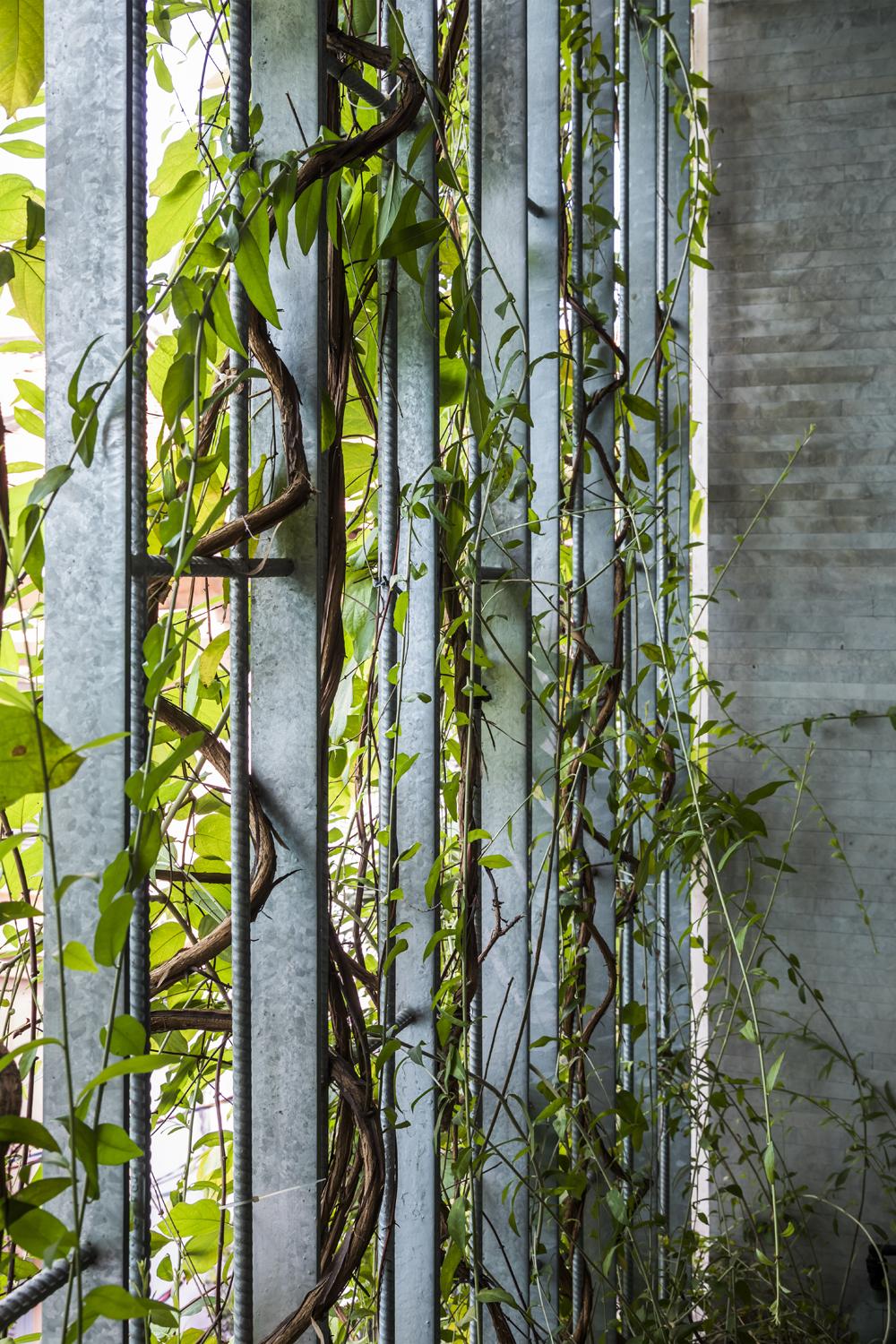 Do hoàn cảnh của công trường, việc mở tòa nhà bị hạn chế về mặt vật lý ở mặt trước, mặt trên và mặt sau của ngôi nhà. Để điều chỉnh khoảng cách giữa các tòa nhà lân cận trong khi tối đa hóa khu vực mở, chúng tôi bọc ba bề mặt đã nói ở trên bằng một tấm màn che màu xanh lá cây, được làm từ những cây leo mọc trên lưới thép. Lớp mềm này, như một bộ khuếch tán môi trường, lọc ánh sáng mặt trời trực tiếp và ngăn không gian bên trong tiếp xúc quá mức ra bên ngoài, mà không có cảm giác bị cô lập. Nó bao gồm các hộp trồng cây ở mỗi tấm sàn, với các yếu tố thép mạ kẽm được mô đun hóa gắn liền với nó. Cấu trúc này cung cấp một cái nhìn xanh trong toàn bộ ngôi nhà, cũng bảo vệ cư dân khỏi tội phạm đô thị.