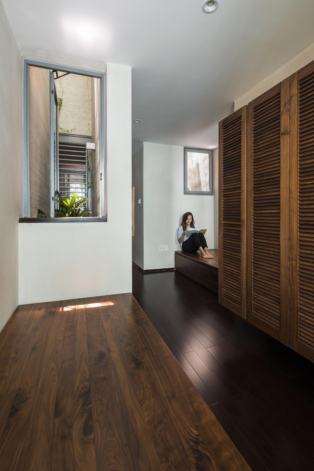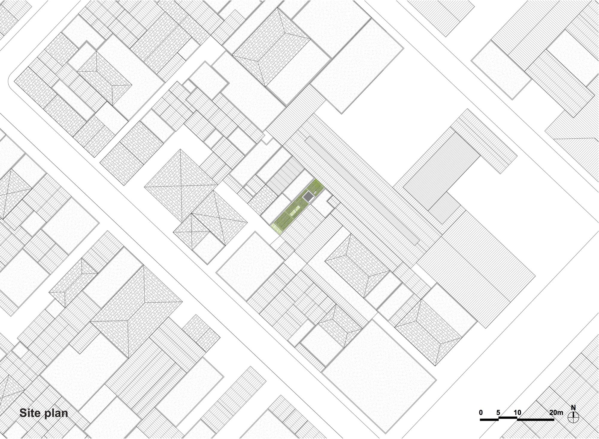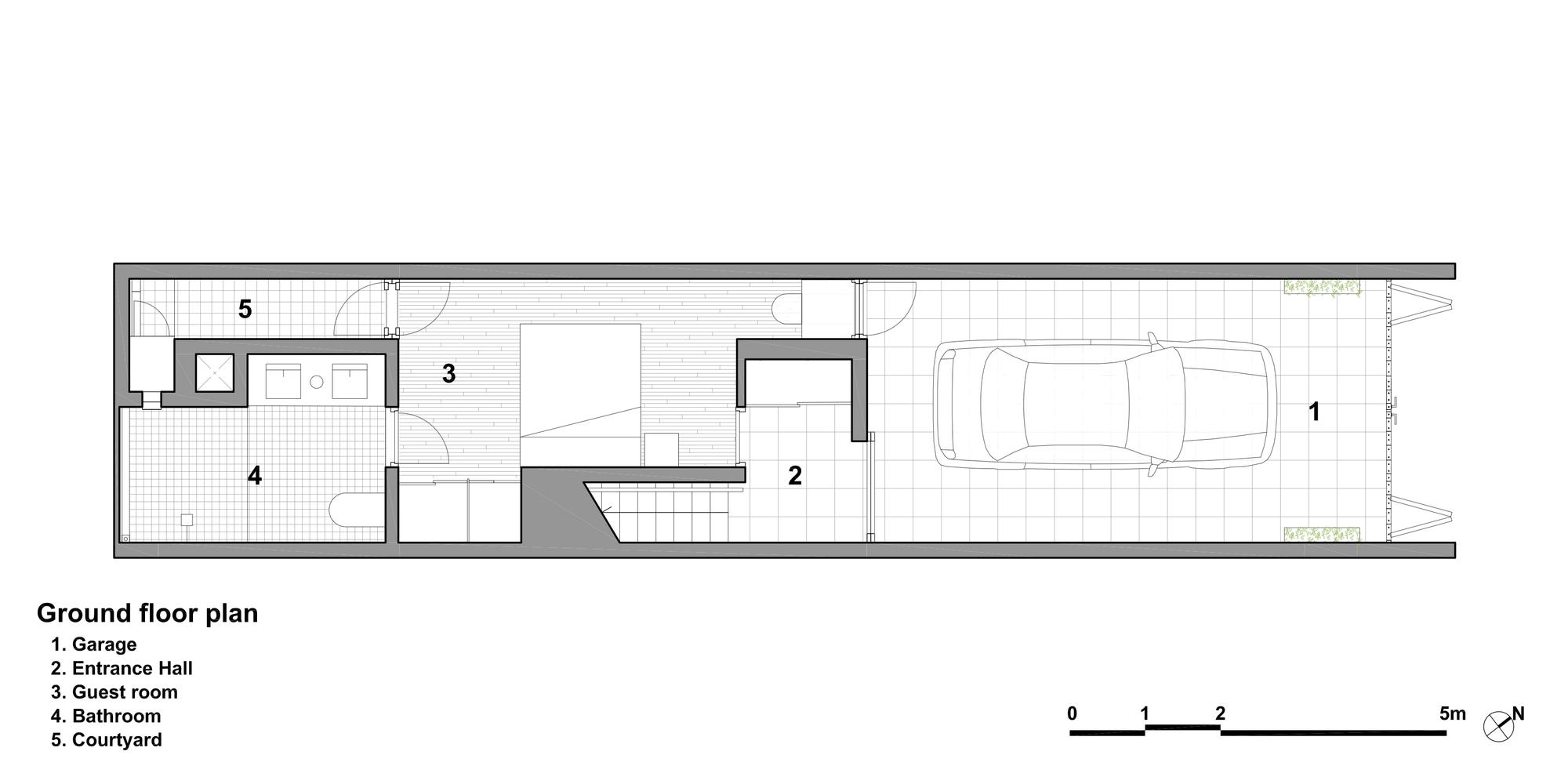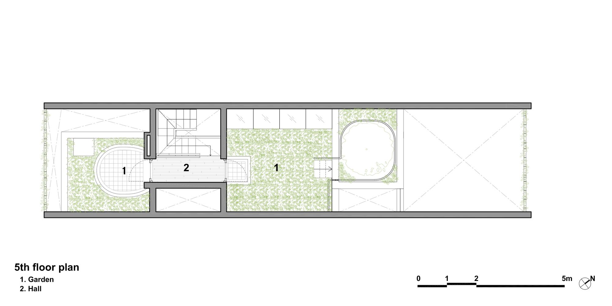 Bên trong mạng che mặt màu xanh lá cây, tòa nhà bao gồm 5 khối giống như các tòa tháp được đặt so le và kết nối với nhau, được bố trí ở giữa hai bức tường ranh giới. Các không gian bên ngoài được tạo ra bởi sự sắp xếp so le của các tập, mà chúng tôi gọi là siêu âm Micro Microids, đóng vai trò trong việc cung cấp vô số tuyến đường chiếu sáng và thông gió gián tiếp trong toàn bộ tòa nhà. Trong lô đất hẹp và sâu được hàng xóm hai bên che chắn, sẽ hiệu quả hơn về mặt môi trường để thúc đẩy thông gió cho từng góc của ngôi nhà, bởi nhiều micro voids voọc, thay vì có một khoảng sân rộng. Các vi voids của Nhật Bản có các lỗ mở trên mỗi tầng, qua đó cư dân có tầm nhìn xuyên suốt và chéo hơn từ mọi nơi, nhìn vào không gian xanh và các không gian khác. Cầu thang cũng được thiết kế là một trong những khoảng trống siêu nhỏ với ánh sáng trên cùng và mở ra đối diện với các phòng. Thành phần xốp của tòa nhà làm giảm việc sử dụng điều hòa không khí để tăng cường thông gió tự nhiên, tạo ra cả kết nối không gian và hình ảnh và độ sâu trong nhà.