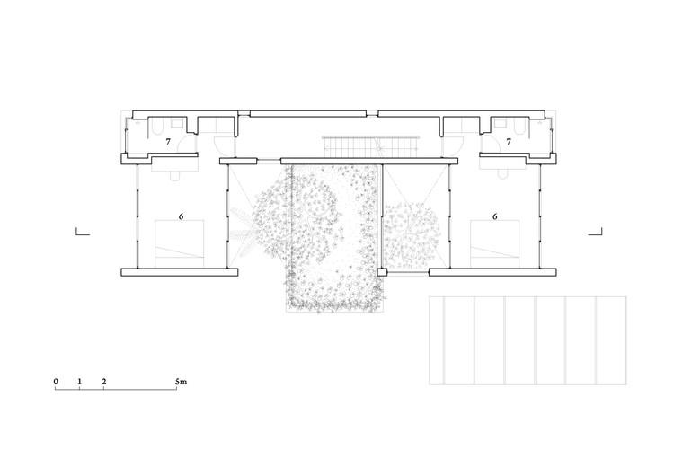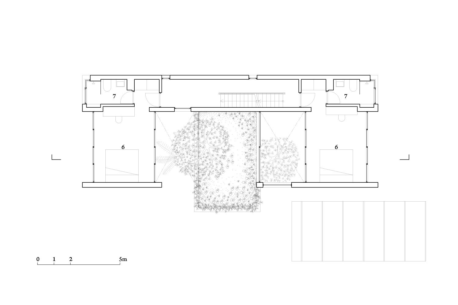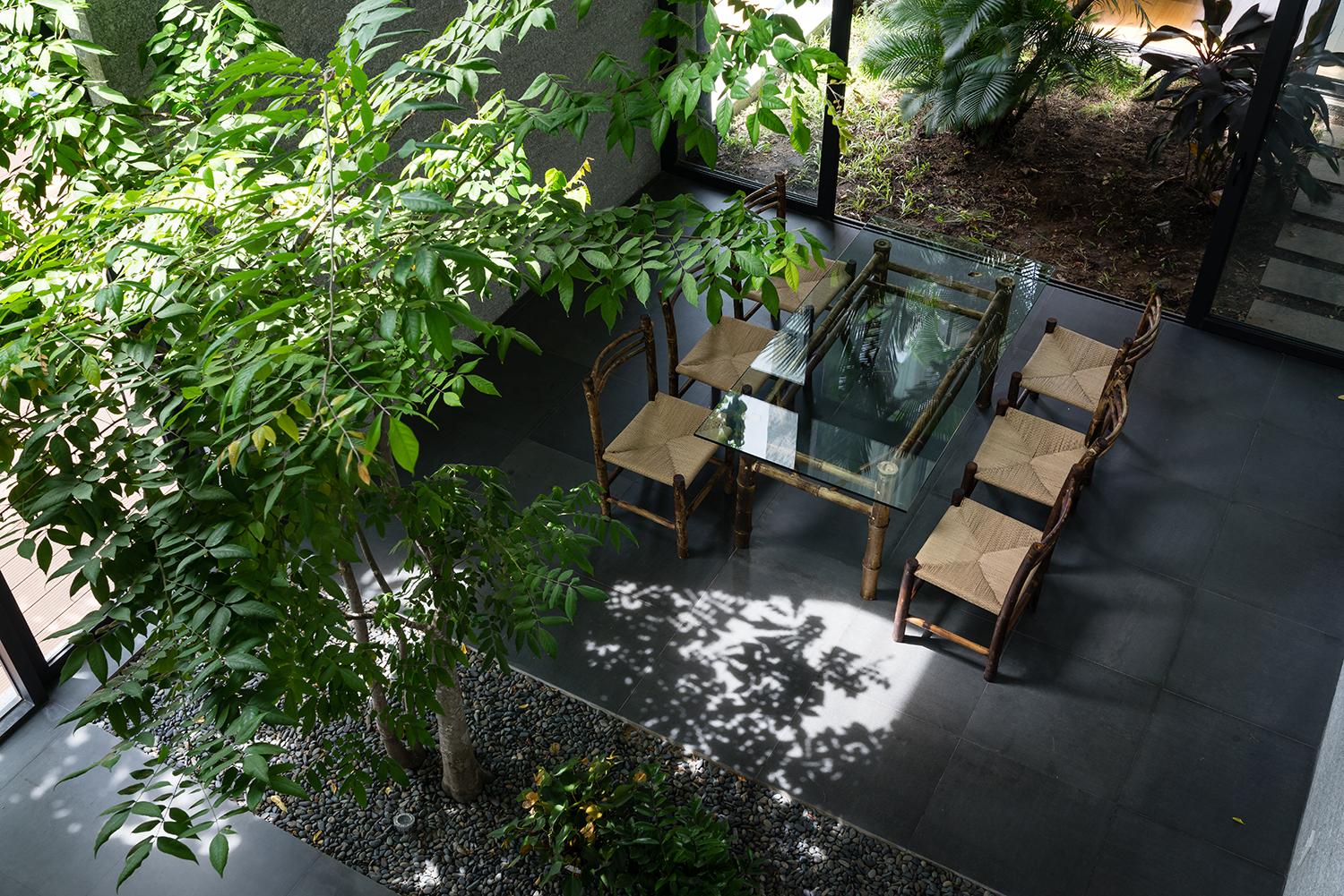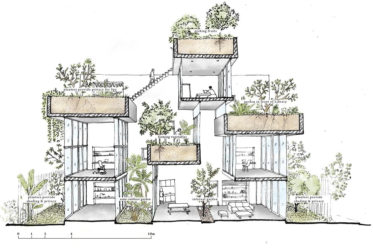 Vườn nằm trên đỉnh của không gian xếp theo chiều dọc; giới hạn bởi cửa kính trượt. Chiến lược này không chỉ cải thiện vi khí hậu bằng cách sử dụng thông gió tự nhiên và ánh sáng ban ngày trong mỗi phòng, mà các khe hở xen kẽ cũng làm tăng khả năng hiển thị và tương tác giữa các thành viên trong gia đình.