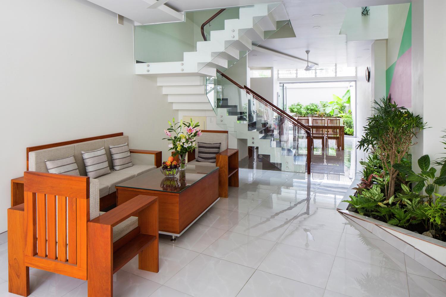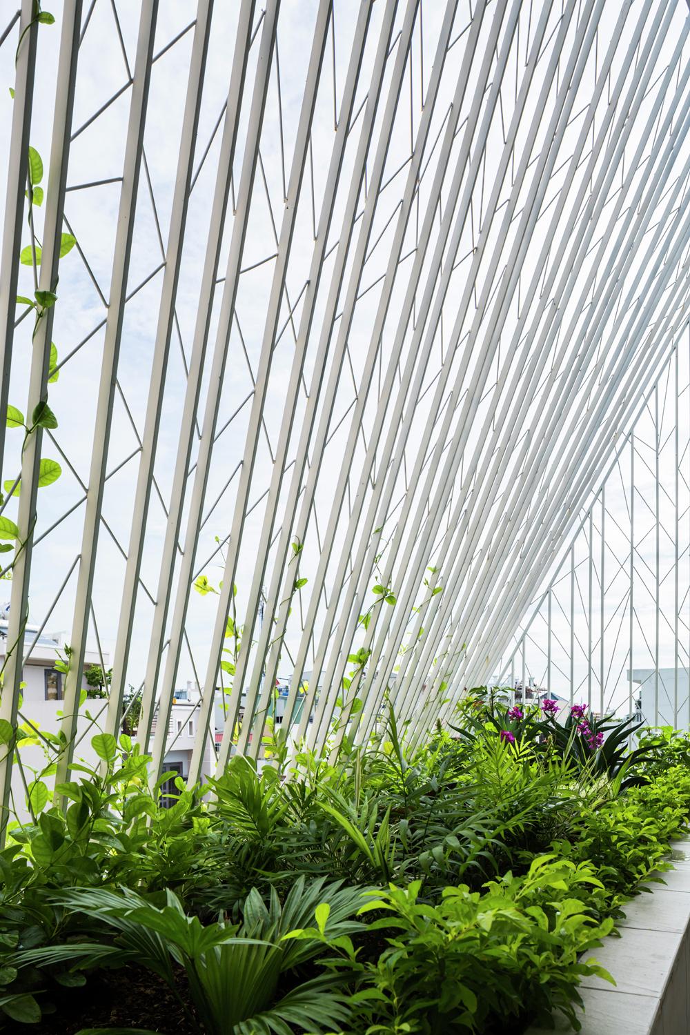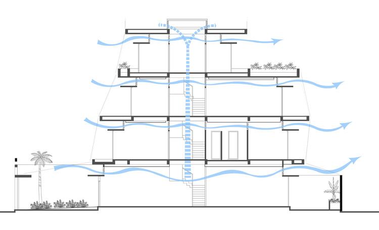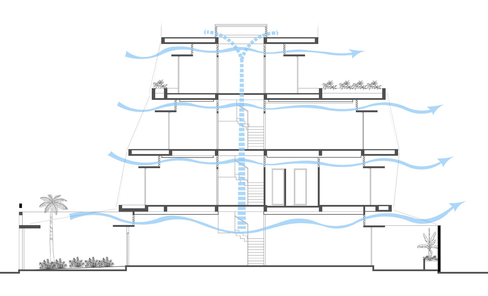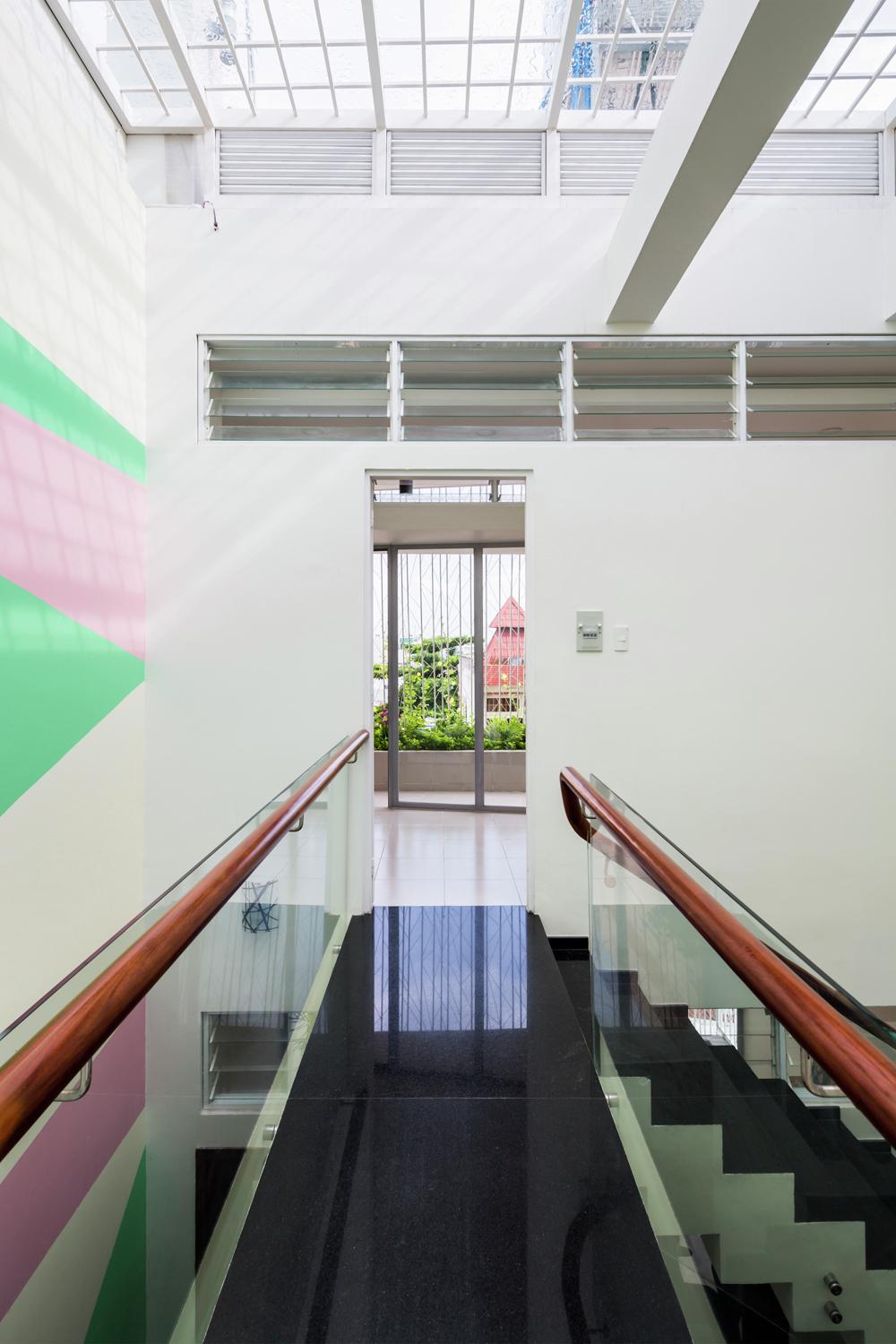 Sự kết hợp của ban công trải rộng trên mỗi tầng, cũng như màn hình an ninh thép, tạo cơ hội cho một kiến trúc vượt ra ngoài chủ nghĩa hiện đại. Kiến trúc sư rất tôn trọng phong cách hiện đại Việt Nam độc đáo cho những ngôi nhà mà các kiến trúc sư Việt Nam đã phát triển trong 80 năm qua. Họ tiếp tục thử nghiệm với các tác phẩm trừu tượng của các dòng, hoa văn, vật liệu, kết cấu, màu sắc, hình dạng và khối lượng. Nhưng những tác phẩm này hầu như luôn trực giao. Thiết kế này không.