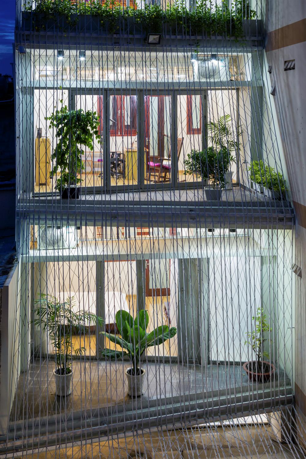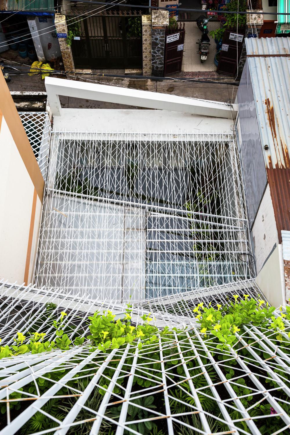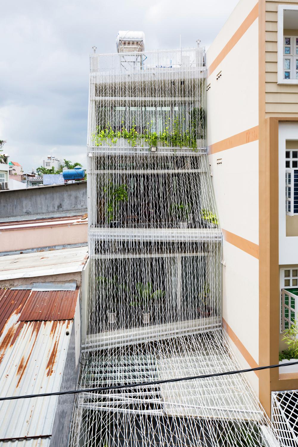 Cửa sổ và cửa ra vào được mở vào ban ngày ở hầu hết các ngôi nhà Việt Nam để thông gió, nhưng chúng phải đóng cửa vào ban đêm để đảm bảo an ninh. Trong hầu hết các ngôi nhà, lưới thép hoặc màn hình được cung cấp ở bên trong của tất cả các cửa sổ và cửa ra vào. Trong ngôi nhà này, lưới thép bao bọc ngôi nhà ở bên ngoài của tất cả các ban công, vì vậy cửa sổ và cửa ra vào có thể vẫn mở bất cứ lúc nào nếu muốn. Hiệu ứng giống như sống trong lồng chim thay vì các tế bào tù. Các màn hình thép bên ngoài ban công do đó mở rộng các phòng để bao gồm các ban công.