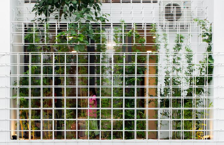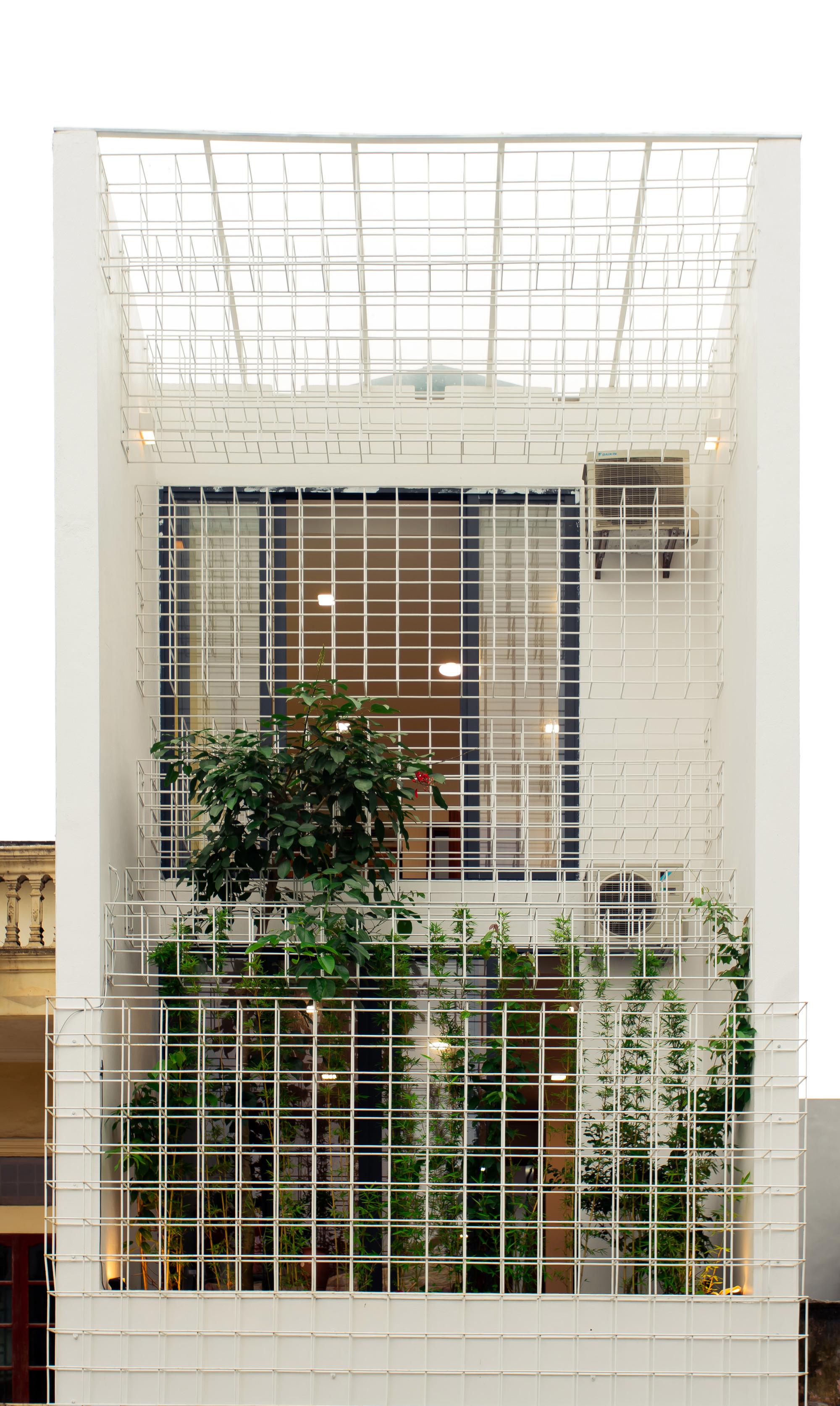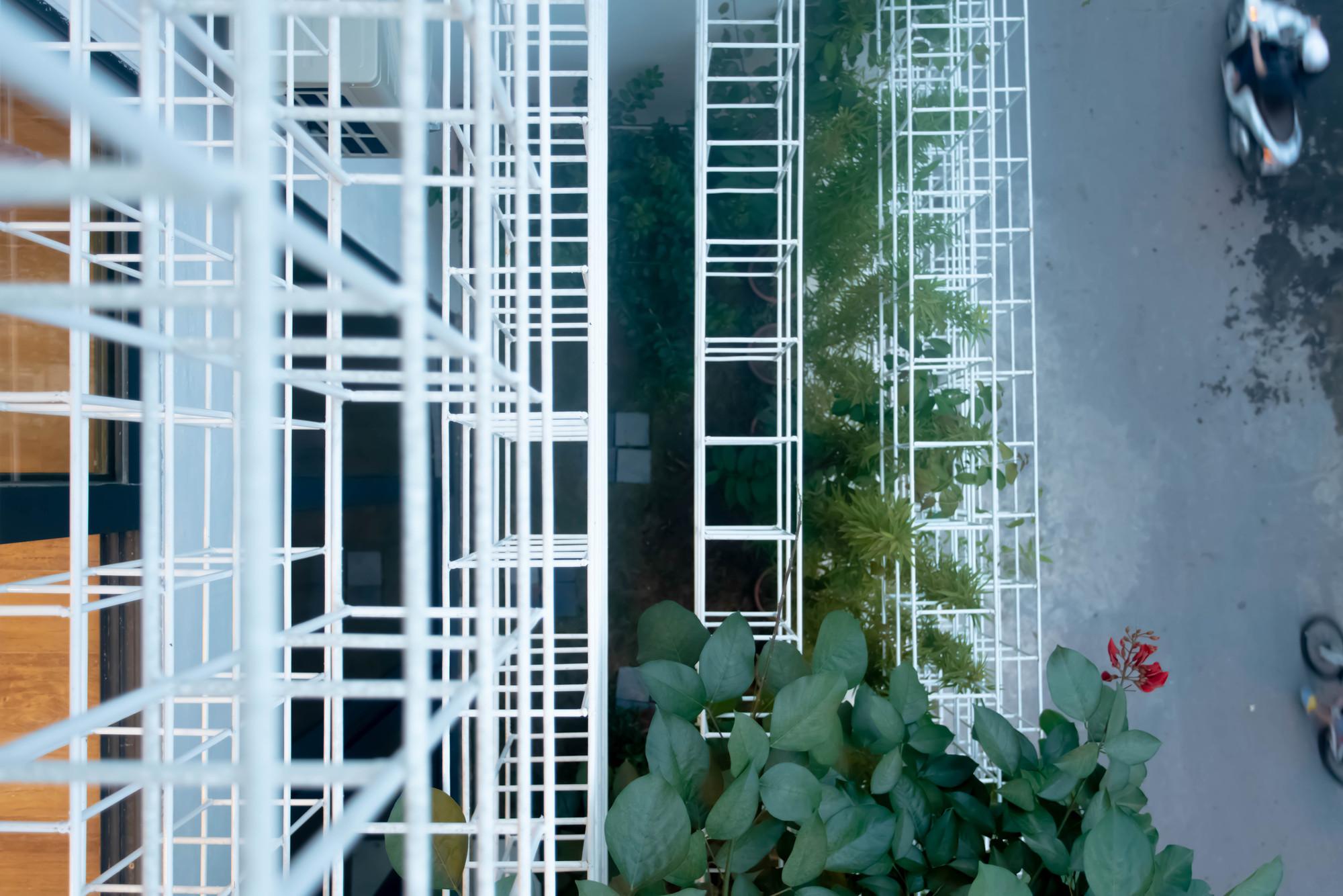 Điểm cuối cùng, thiết kế tập trung vào sở thích của người dùng như trồng cây và giữ cho khu vườn của họ khỏe mạnh. Tạo một khu vườn nhỏ phía trước tầng 2, ngôi nhà có “mặt xanh” nơi cây lá, cây leo kết hợp với lưới thép hình vuông tròn, vừa góp phần phủ xanh mặt bằng vừa tạo nên một không gian mới cho "Nghệ thuật trên mặt tiền". Chúng tôi đặt tên nó là “Nhà lồng” vì chúng tôi lặp lại một ngôn ngữ thiết kế dựa trên hình dạng của một cái lồng. Sự lặp lại có thể được nhìn thấy trong toàn bộ ngôi nhà từ mặt tiền vuông vắn (phía trước và phía sau cấu trúc), cửa chính vào đến đèn tre làm thủ công trong phòng khách.