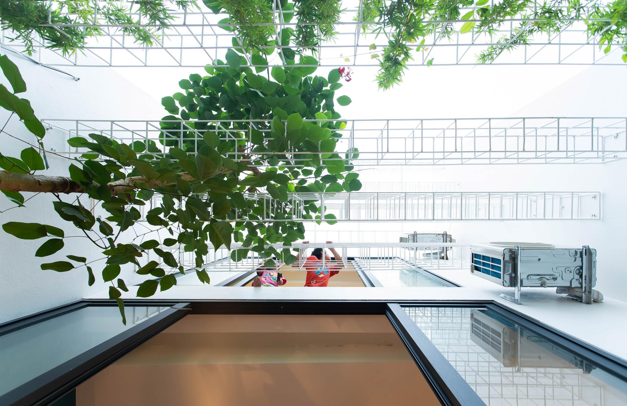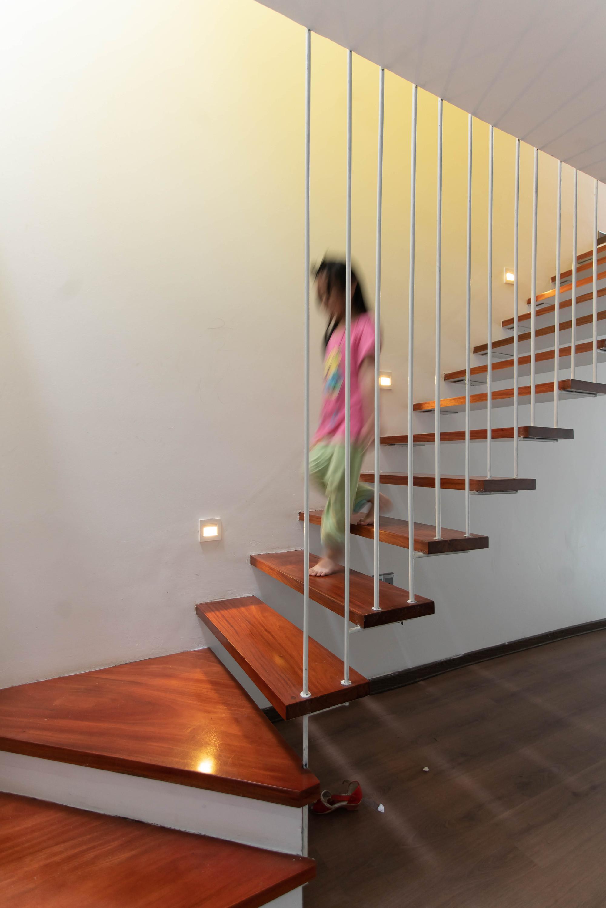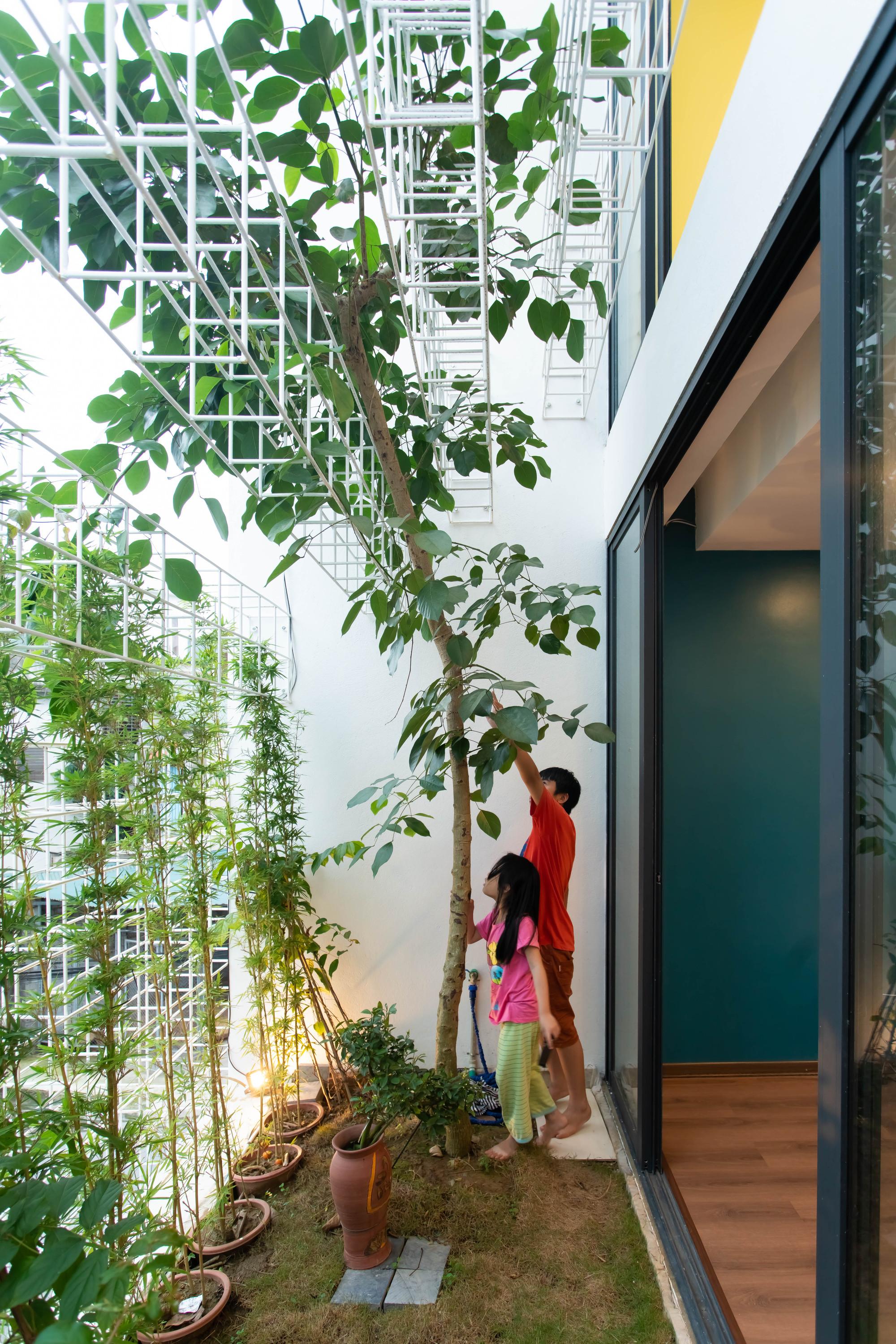 Điểm cuối cùng, thiết kế tập trung vào sở thích của người dùng như trồng cây và giữ cho khu vườn của họ khỏe mạnh. Tạo một khu vườn nhỏ phía trước tầng 2, ngôi nhà có “mặt xanh” nơi cây lá, cây leo kết hợp với lưới thép hình vuông tròn, vừa góp phần phủ xanh mặt bằng vừa tạo nên một không gian mới cho "Nghệ thuật trên mặt tiền". Chúng tôi đặt tên nó là “Nhà lồng” vì chúng tôi lặp lại một ngôn ngữ thiết kế dựa trên hình dạng của một cái lồng. Sự lặp lại có thể được nhìn thấy trong toàn bộ ngôi nhà từ mặt tiền vuông vắn (phía trước và phía sau cấu trúc), cửa chính vào đến đèn tre làm thủ công trong phòng khách.