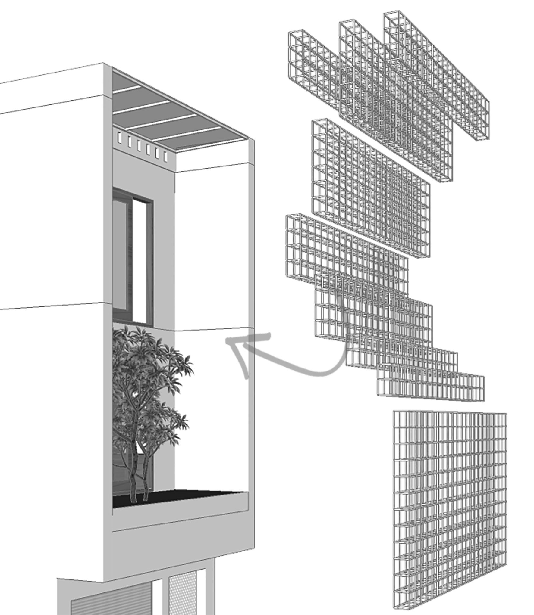 Sau một số cuộc thảo luận, chúng tôi đã đưa ra một số ý tưởng cho thiết kế của mình, tập trung vào ba điểm chính. Người đầu tiên, chúng tôiđề xuất một mặt tiền nhằm tạo không gian mở cho người dân có tầm nhìn bao quát nhưng vẫn có cảm giác riêng tư khi sống trong nhà. Mặt tiền được làm bằng các thanh tròn 10 mm có kiểu cấu trúc dựa trên hình thức lưới vuông. Vì vậy, những người sống trong ngôi nhà có thể có chỗ cho các hoạt động của họ bên trong nhưng họ vẫn ở khá gần với không gian bên ngoài để quan sát hoạt động và thế giới tự nhiên bên ngoài.